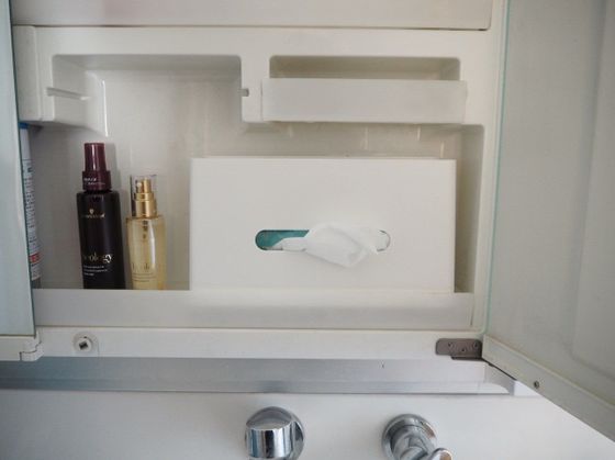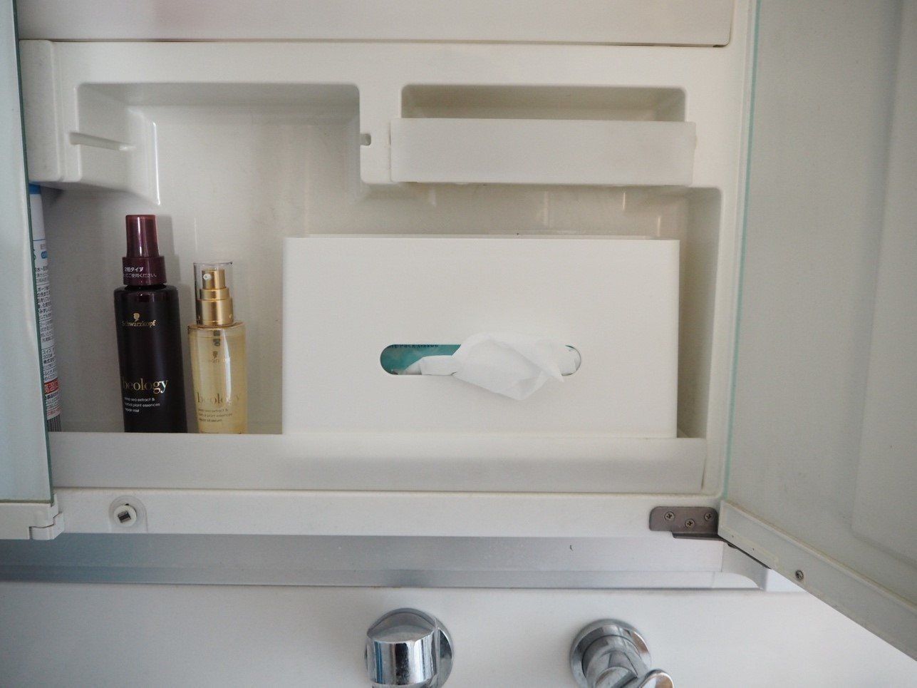 なんと、洗面台収納の中にもぴったり!ティッシュを手前に引き出す形になるので使いやすい♪