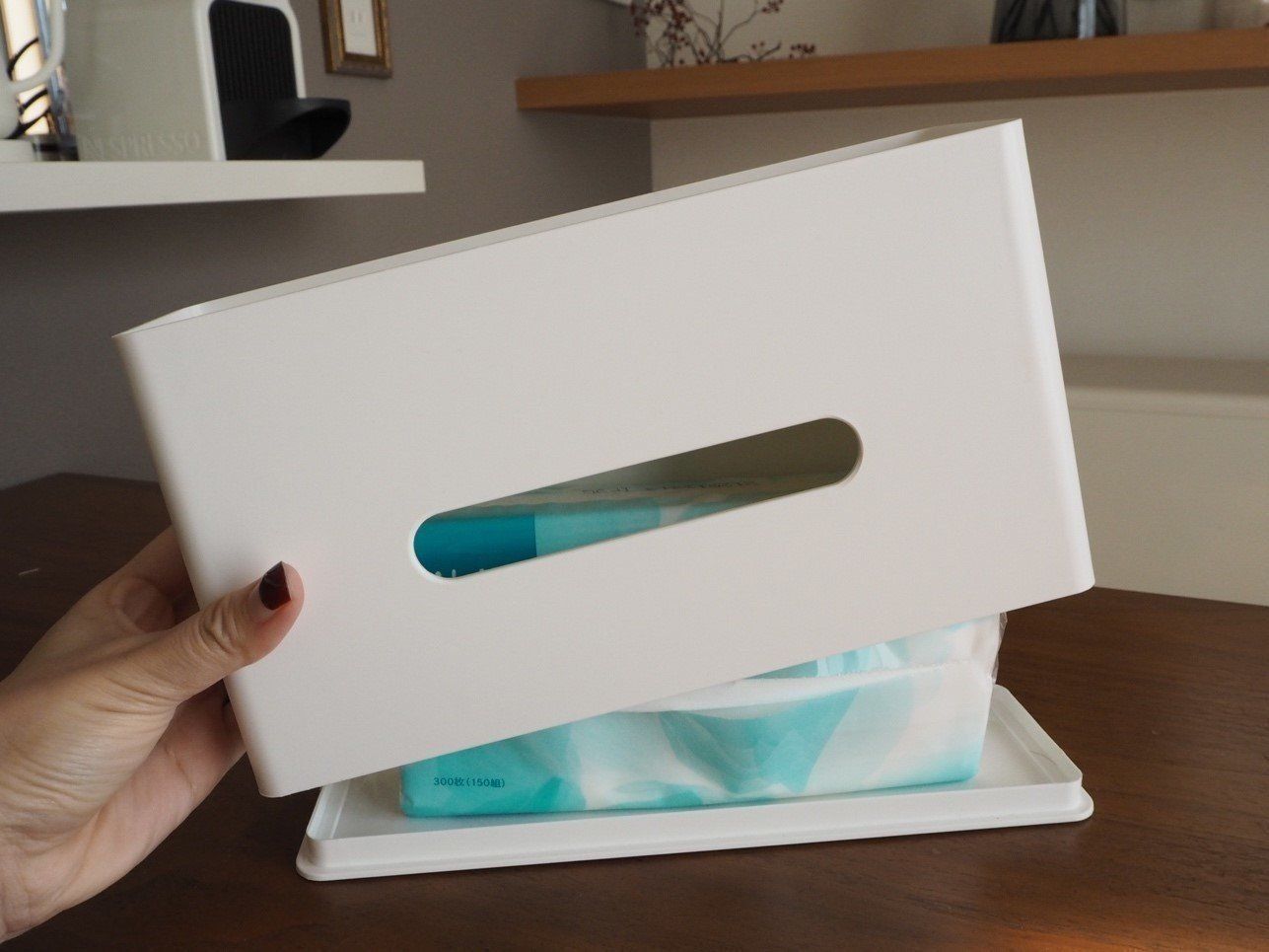 ニトリ「ティッシュケース NOSETE」(740円)は、シンプルでティッシュを自立させる形。インテリアにも馴染んでGOOD!