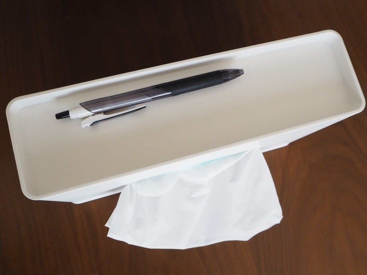 上がくぼんだデザインなのでハンコやボールペンなど、よく使うものの定位置にするのもいいですね。取りやすい、しまいやすいところにあれば「どこにあるの〜?」もなくなり、家族も元に戻しやすいですよ!