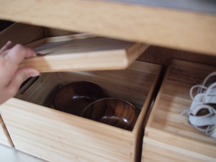 高さが変えられる不織布仕切ケースなどといっしょに使えば、もっと多様な使い方ができること間違いなし!丈夫で狂いの少ない竹の集成材を使ってつくっているので、整頓したさまも美しく、見せる収納をつくる際にもやりたいことを実現させてくれそう。