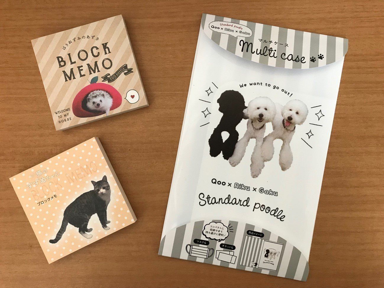 柴犬のまるちゃん以外にも「猫のすずめ」シリーズ、「はりねずみのあずき」シリーズ、「スタンダードプードルのQoo×Riku×Gaku」シリーズなどもあります。