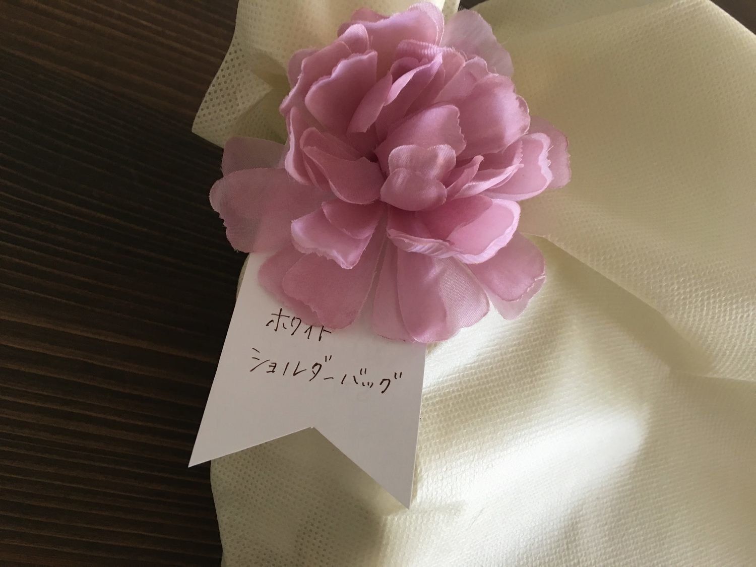 ラッピング用についているタグとコサージュを使って、中身の記入を。これで同じ物がいくつか並んでも区別ができます。