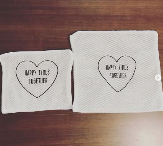 ハートと、英文字のイラストがかわいいメッシュポーチ。小物はもちろん、洗濯ものを入れればそのまま洗うことができます。トラベルポーチとして大活躍するはず。