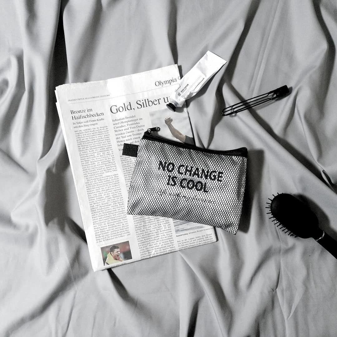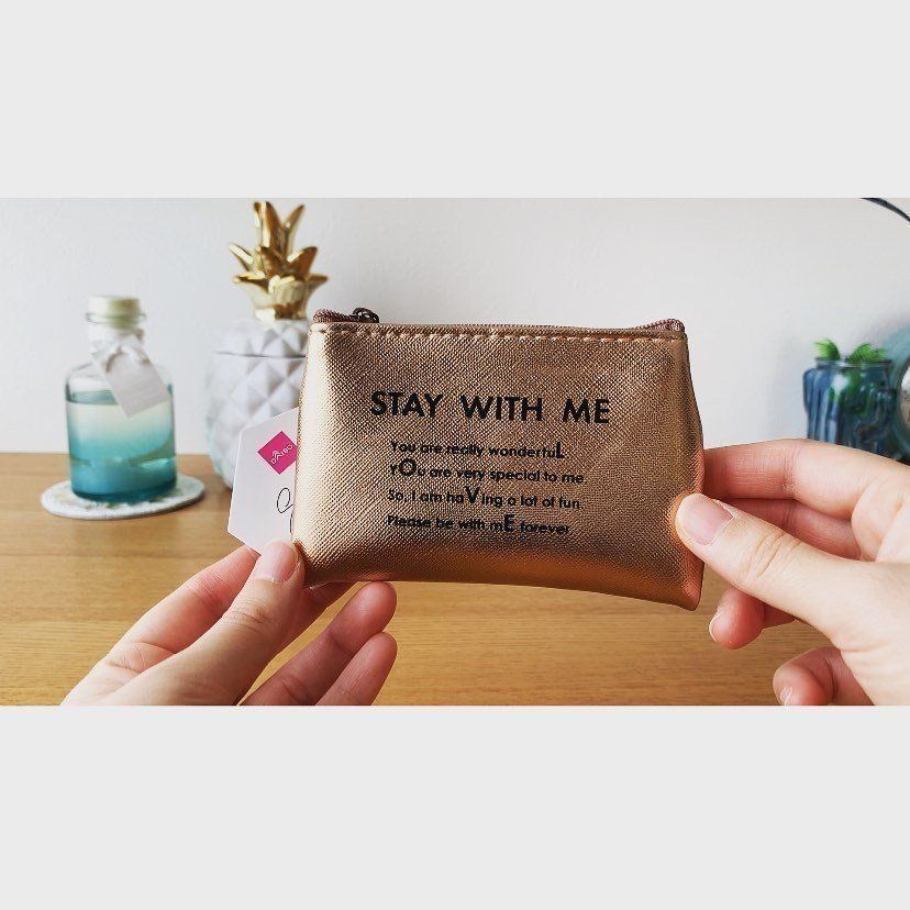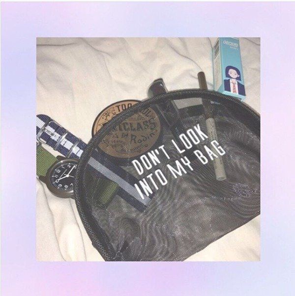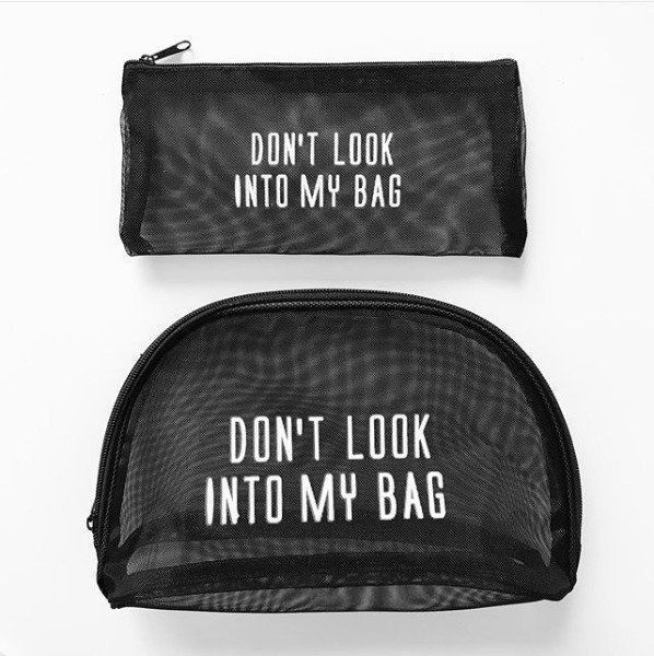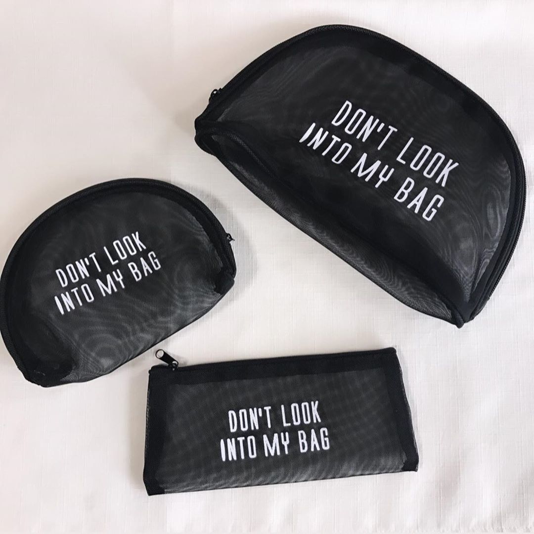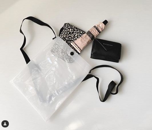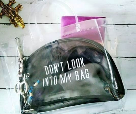 クリアバッグにポーチを合わせれば、こんなにおしゃれ!コーディネートを引き立ててくれるアイテムに変身です。どちらもビニール製なので、とにかく軽いのもいいですよね。中から見える「DON’T LOOK INTO MY BAG(バッグの中を見ないで)」のロゴがとってもキュート。