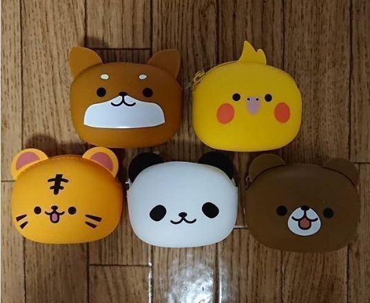 柴犬、オカメインコ、トラ、パンダ、クマの顔の小さなポーチ。コインケースとしても、鍵や薬などのこまかいものを入れるポーチとしても使えます。全種類そろえたくなるかわいさですね。