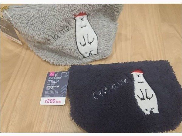 こちらは200円商品の人気キャラクターコラボポーチ。モノトーンのキャラクターがプリントされた大人っぽいデザインです。これで200円はスゴイ!