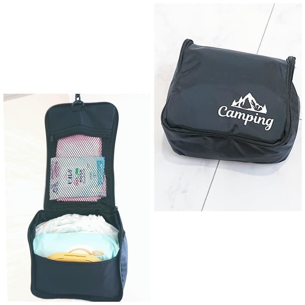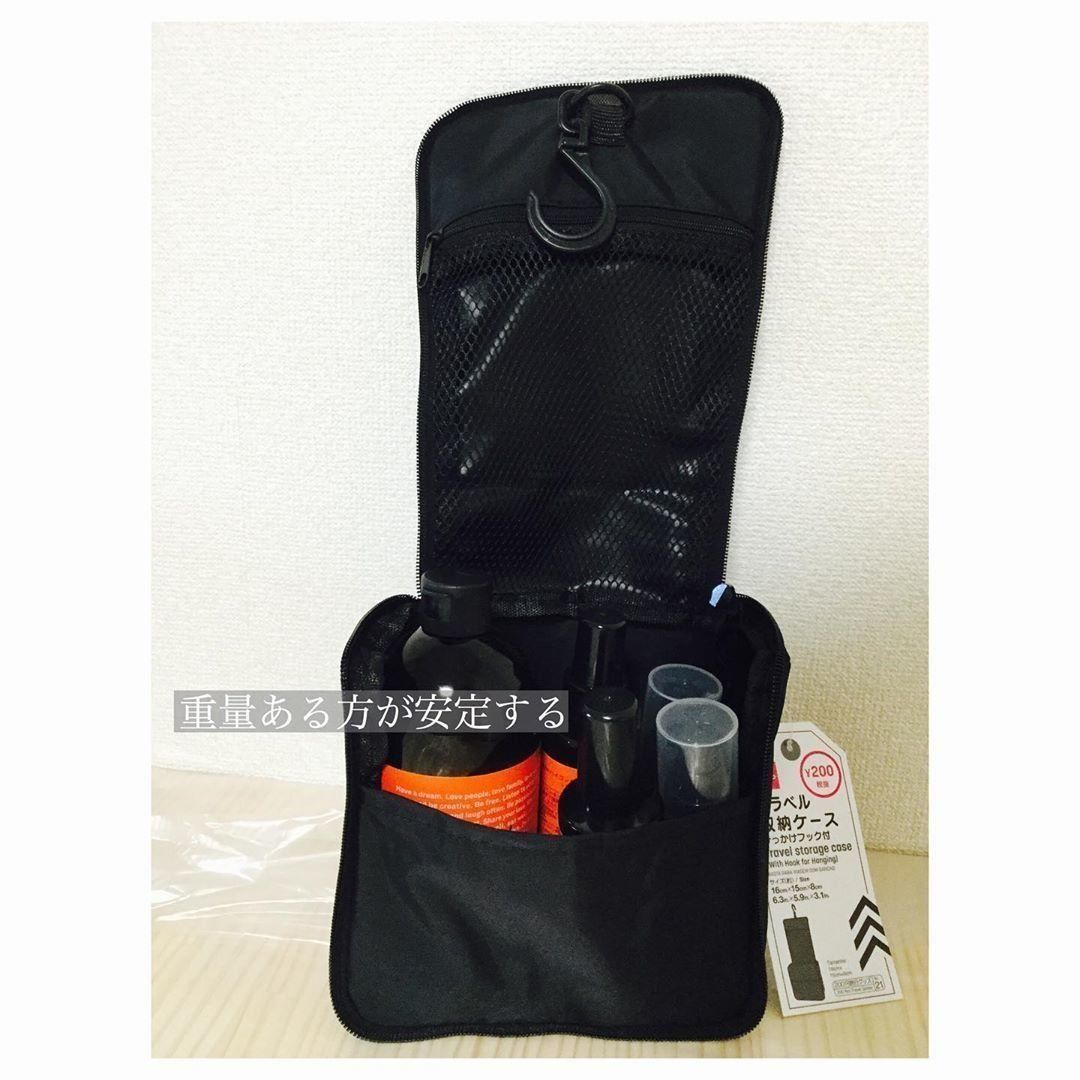 フックつきのトラベル収納ケース。そのまま引っかけて使用することができる便利アイテムです。たっぷり量が入るため、家の中だけではなく外出時に役立ちます。