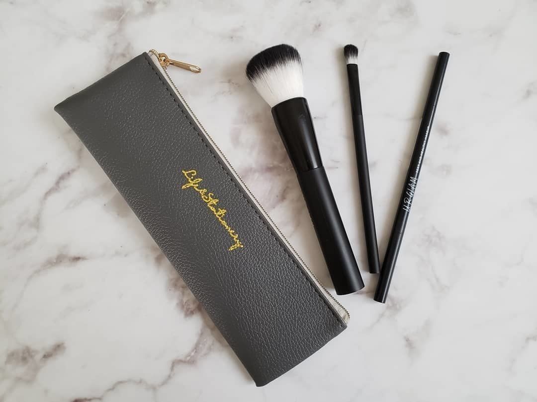 レザー風の生地と、ゴールドの英字ロゴが高級感抜群のポーチです。筆記用具やメイクブラシをコンパクトに持ち歩くことができます。