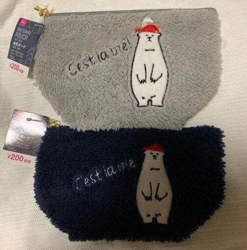 こちらは赤い帽子の白クマさんがかわいいダイソーのふわもこポーチです。200円の商品になりますが、触り心地もよく、秋冬用としてはちょうどよいですね。