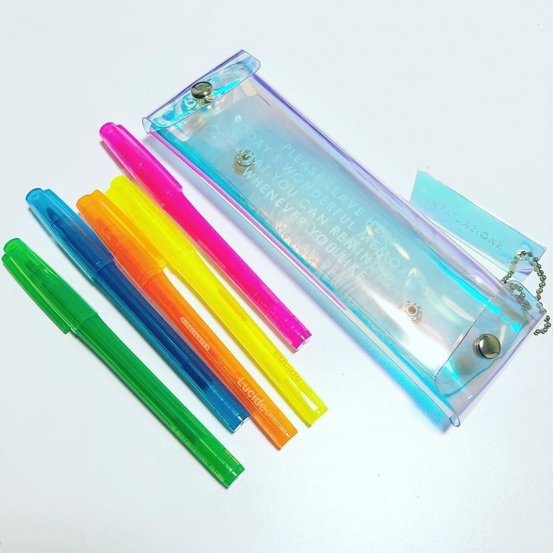キラキラしたオーロラカラーがおしゃれな、ビニールペンケースです。スリムなのでバッグの中で場所を取らずに持ち歩けます。かわいい蛍光ペンとセットで!