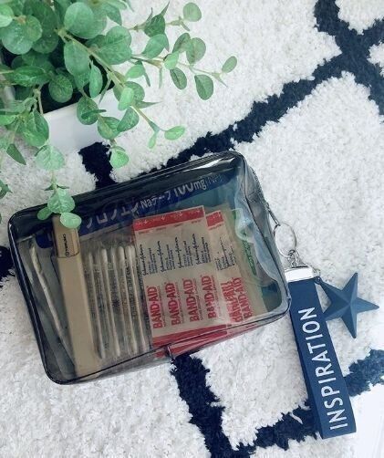 半透明のビニールポーチは綿棒や絆創膏などを入れる救急ポーチとして活用!中が見えるので取り出しやすく、便利ですね。