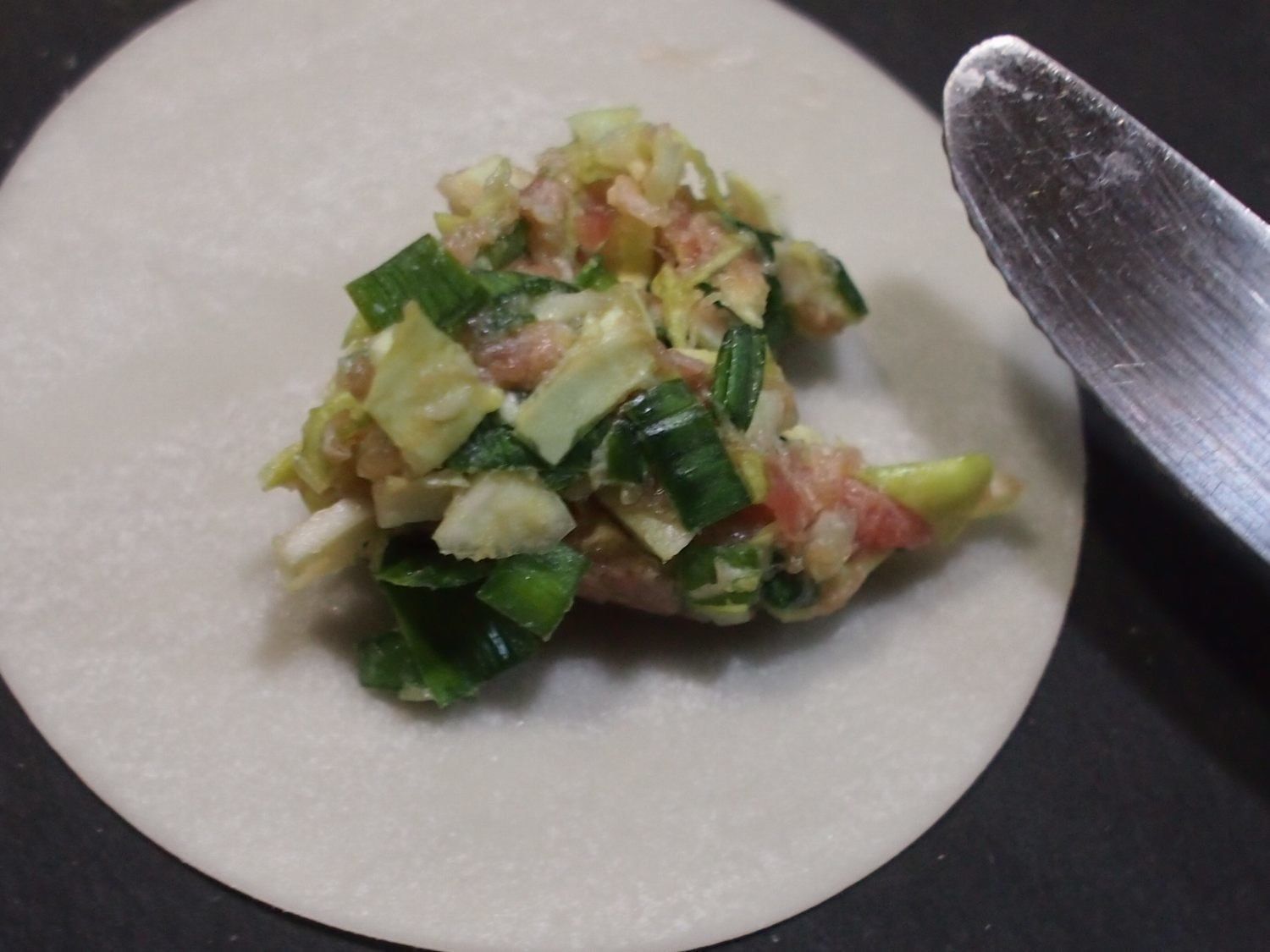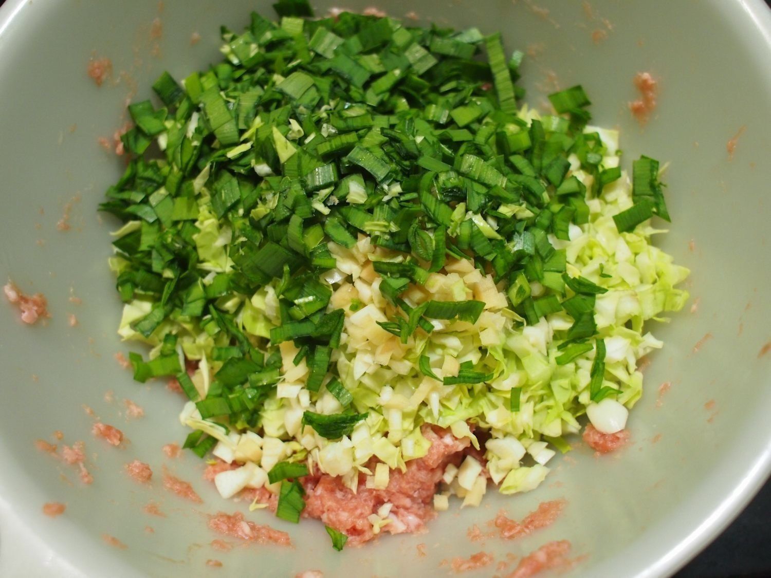 野菜を細かく刻んで、さきほどのひき肉と混ぜていきます。このとき、混ぜ過ぎないように注意。天地を2~3回ひっくり返して、なじませるくらいで大丈夫です。しっかり混ぜてしまうと、具材から水分が出てしまい、味が落ちる原因になります。