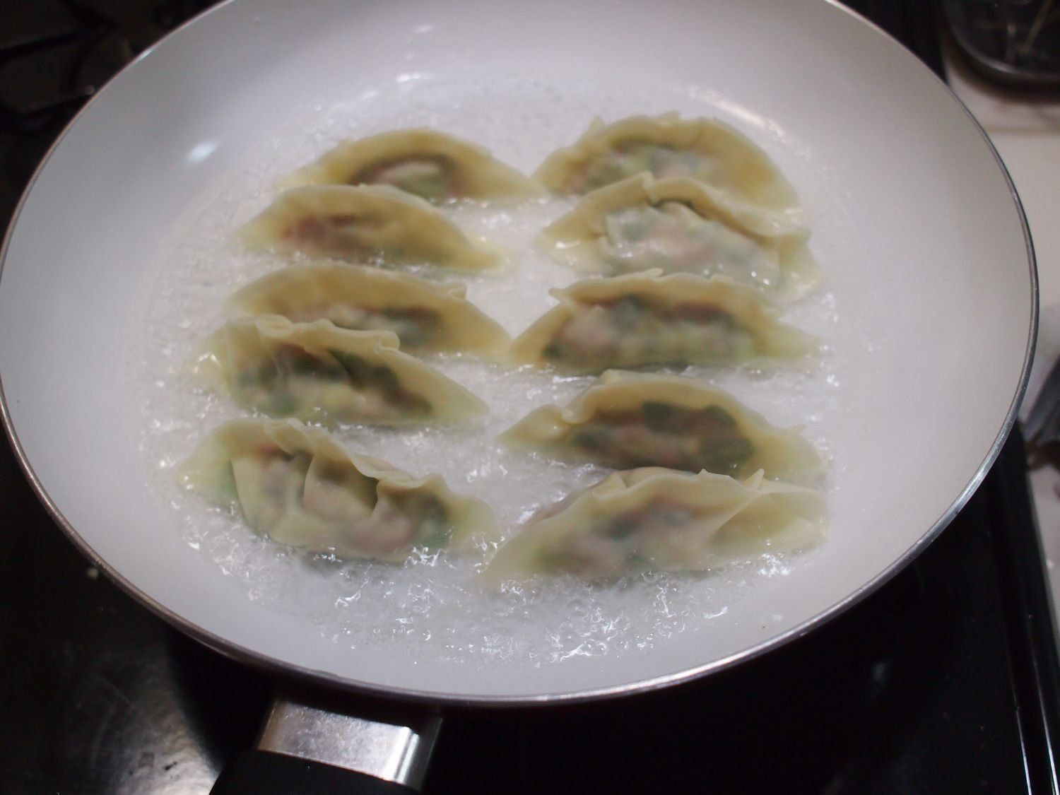 餃子を蒸し焼きにする際は、水でなくお湯にしましょう。町中華のプロによれば、お店のコンロは火力があるので、水でもいいのですが、家庭ではお湯を使ったほうが温度の変化が少なく、おいしく焼きあがるとのことでした。お湯の量はフライパンの大きさにもよりますが、餃子の下1/3が浸るくらい入れて、ふたをしましょう。