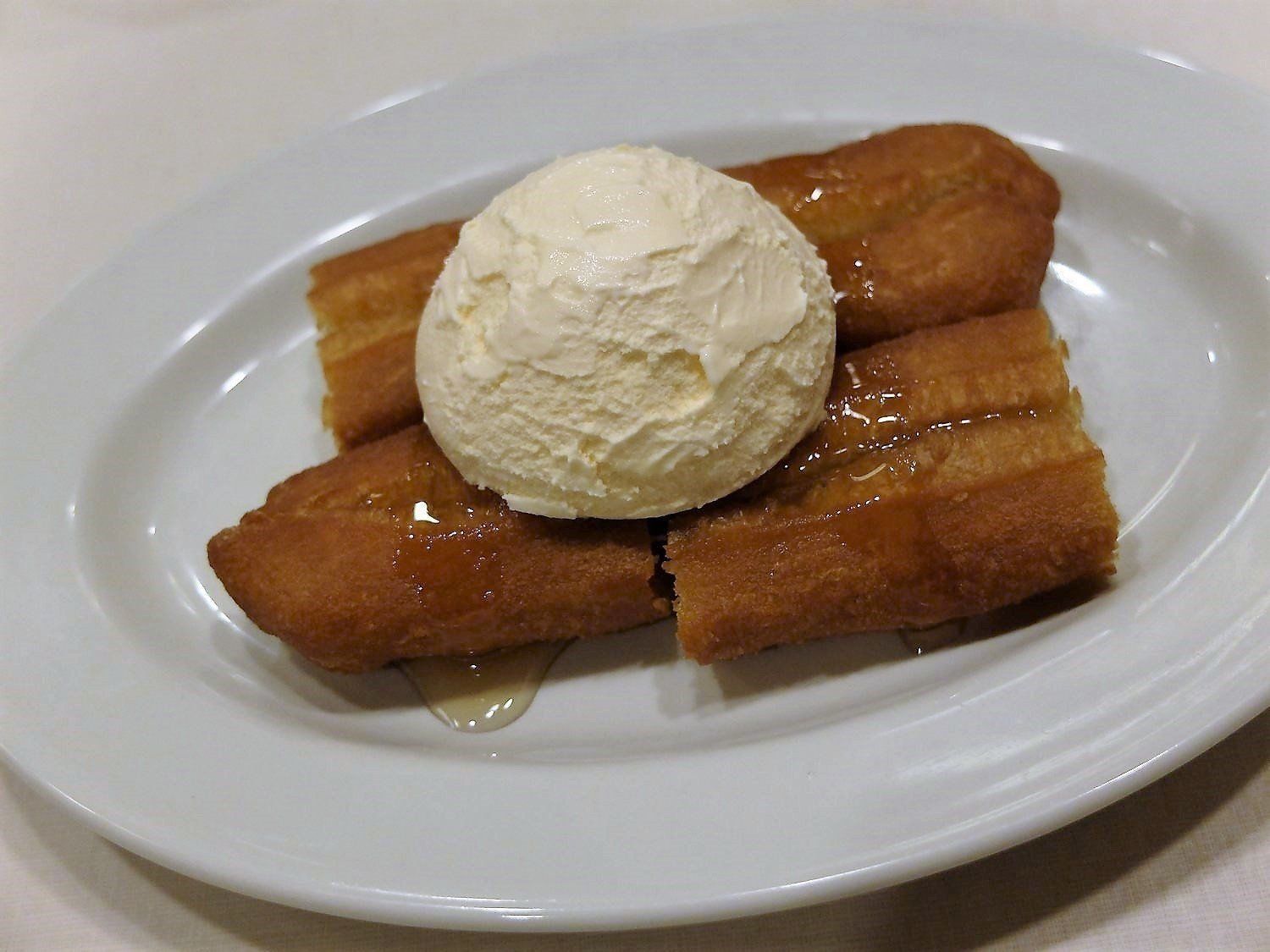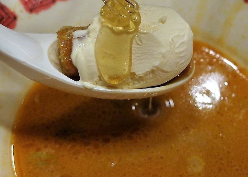 麺ランチで「担担麺」(699円)を注文し、食べ終えたら、「はちみつ揚げパンバニラアイス添え」(349円)を注文します。残った担担麺の汁に「はちみつ揚げパン」を浸して、アイスクリームをのせて食べます。
