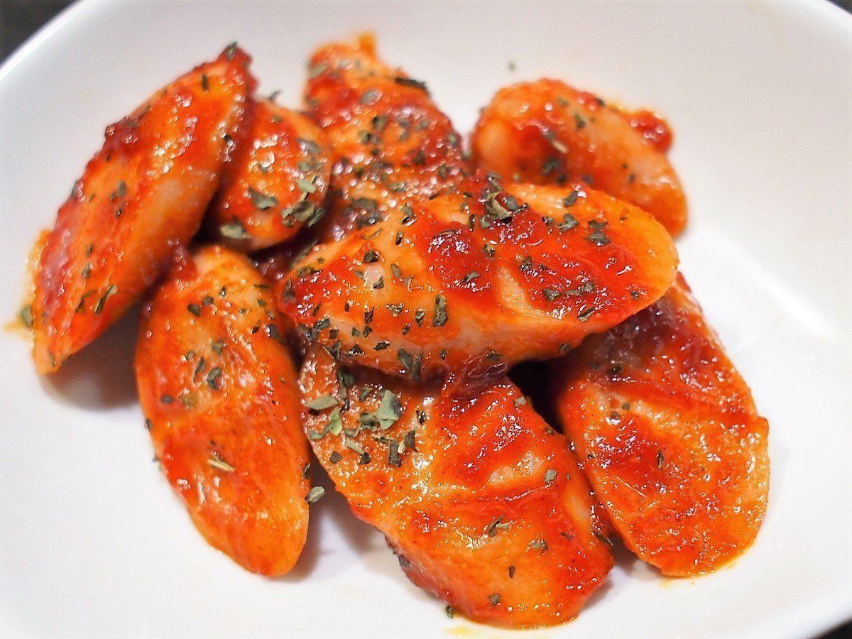 作り方を聞けばめちゃくちゃ簡単。フライパンにバター10gを入れて、スライスしたギョニソ(魚肉ソーセージ)を少し焦げ目がつくまで炒めます。続けてケチャップを入れて少し炒め、最後に乾燥バジルをかけて出来上がり。