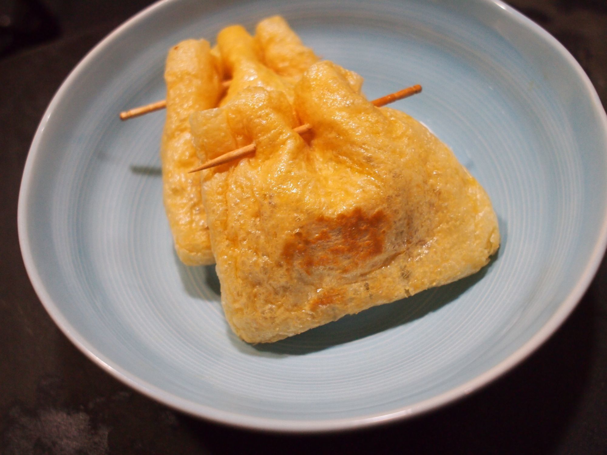 作り方は簡単。納豆1パックをタレ、からしを入れて、かき混ぜます。半分に切った油揚げに混ぜた納豆をスプーンですくって入れ、爪楊枝で閉じます。閉じた油揚げをフライパンに油は引かず乾煎りします。ちょっと焦げ目がつけばできあがり。