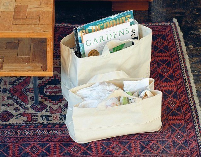 シンプルでクリーンな印象の布製バスケット。雑誌やオムツセットなど、よく使う「生活感のある物」をポンと入れておけば、使いやすいうえに整って見えます。軽量で取っ手つきなので、持ち運びもラク!