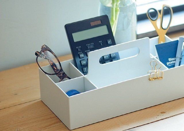 出しっ放しOKなルックスなので、よく使うものの収納にぴったり。散乱しがちな文房具やテーブル小物も、仕分けしやすいこのボックスに収めれば瞬時に片づいた印象になります。持ち運びもしやすいので、メイク道具や救急用品などを入れて、家中で愛用している人、多数!