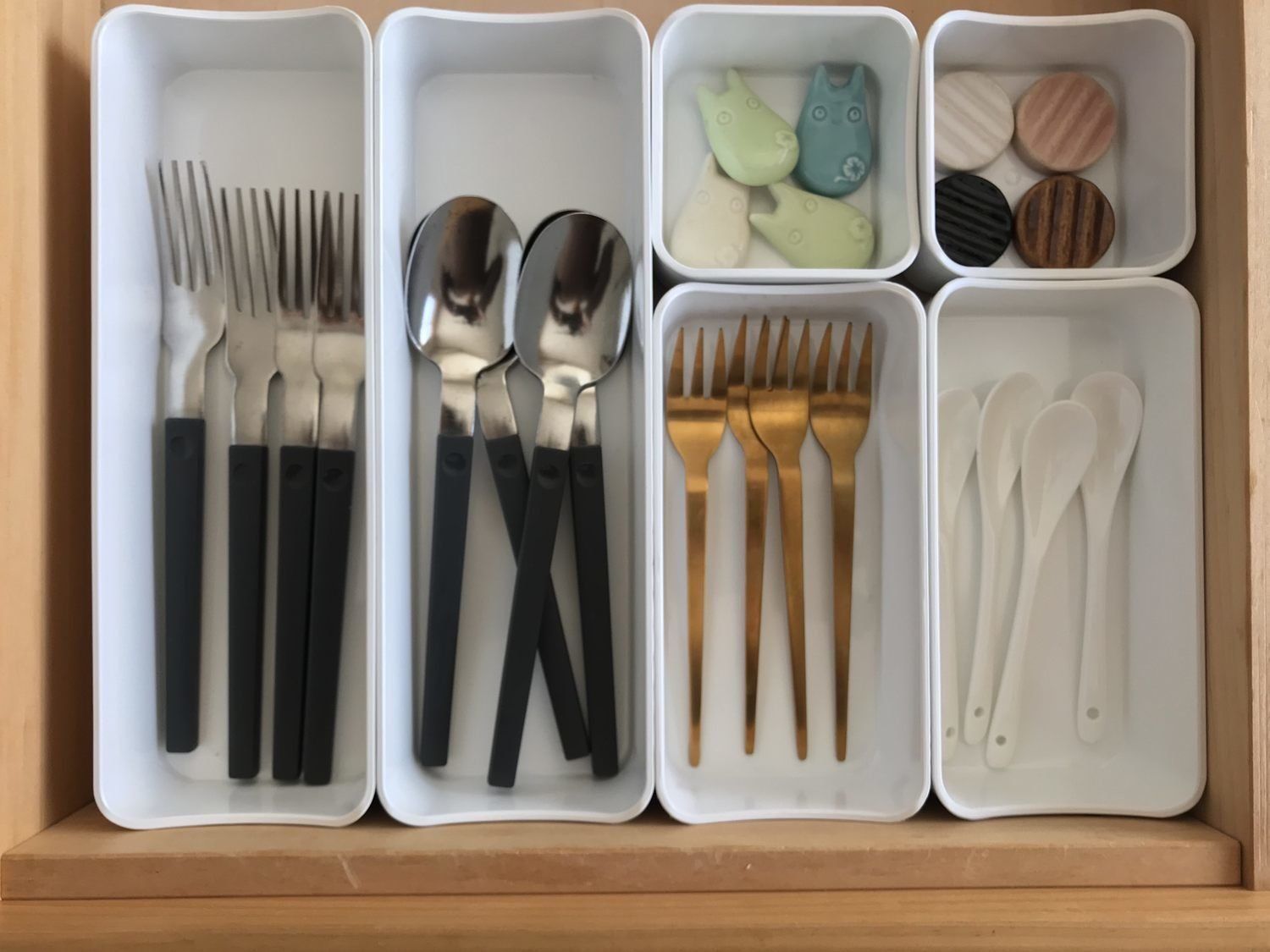 Lのトレーには大きめのカトラリー、Mのトレーには小さめのカトラリー、Sのトレーには箸置きなどサイズごとにすっきり分けられて、デッドスペースが生まれないところもうれしい!