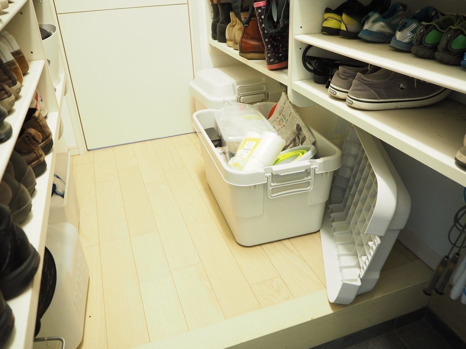 しっかりふたがしまるので、車や玄関回りなどの清掃グッズ入れなどにも使えますが、とくにおすすめする使い方は防災グッズ入れ。紙皿、割りばしなどと一緒に保存食をまとめておけば、いざというときに取り出しやすく使いやすいので安心です。ただし、食品は賞味期限があるので、定期的に点検をして入れ替えるようにしましょう。