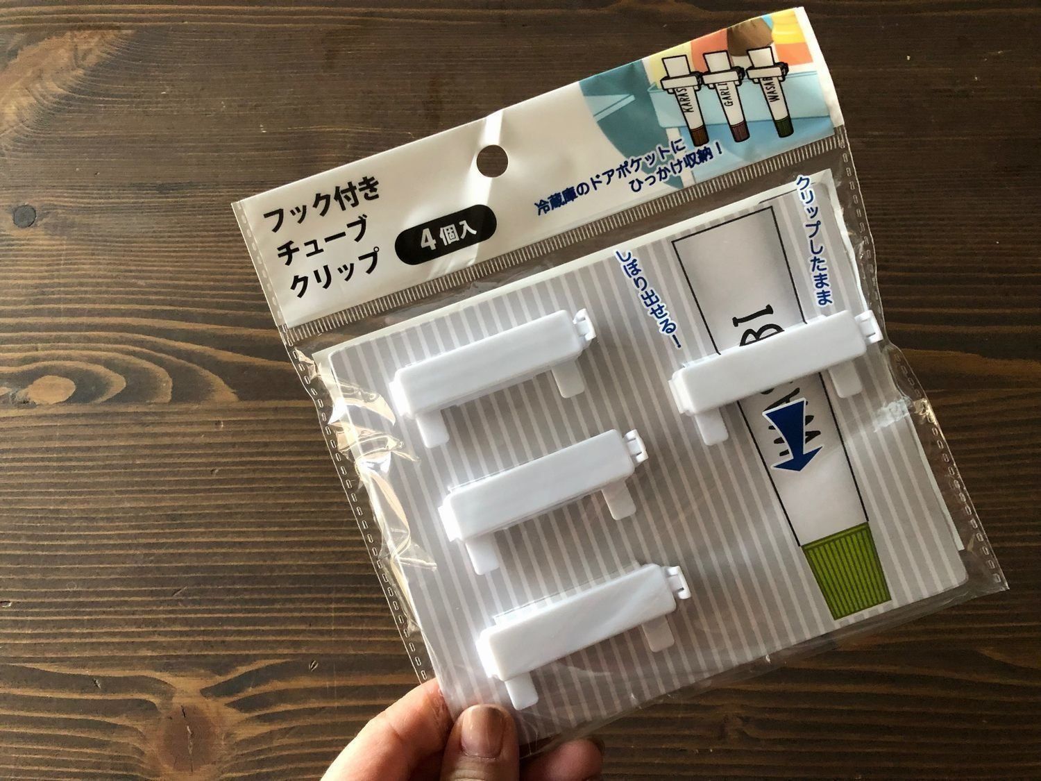 キャンドゥで見つけた薬味チューブ用シール「チューブラベルステッカー」とセリアで見つけた「フック付チューブクリップ」。この100均グッズを使えば、冷蔵庫の中がスッキリモノトーン化!