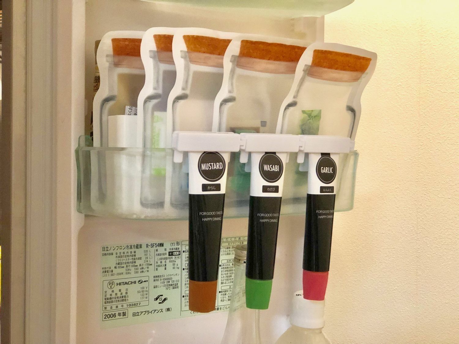 さらに、セリアで購入した「フック付きチューブクリップ」(価格100円)も組み合わせれば、ドアポケットに吊るせるので、薬味が倒れて見えない!なんてこともなくなり、さっと取り出せます。