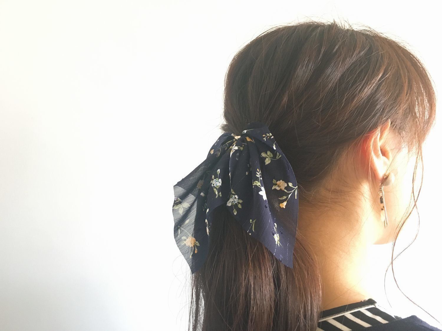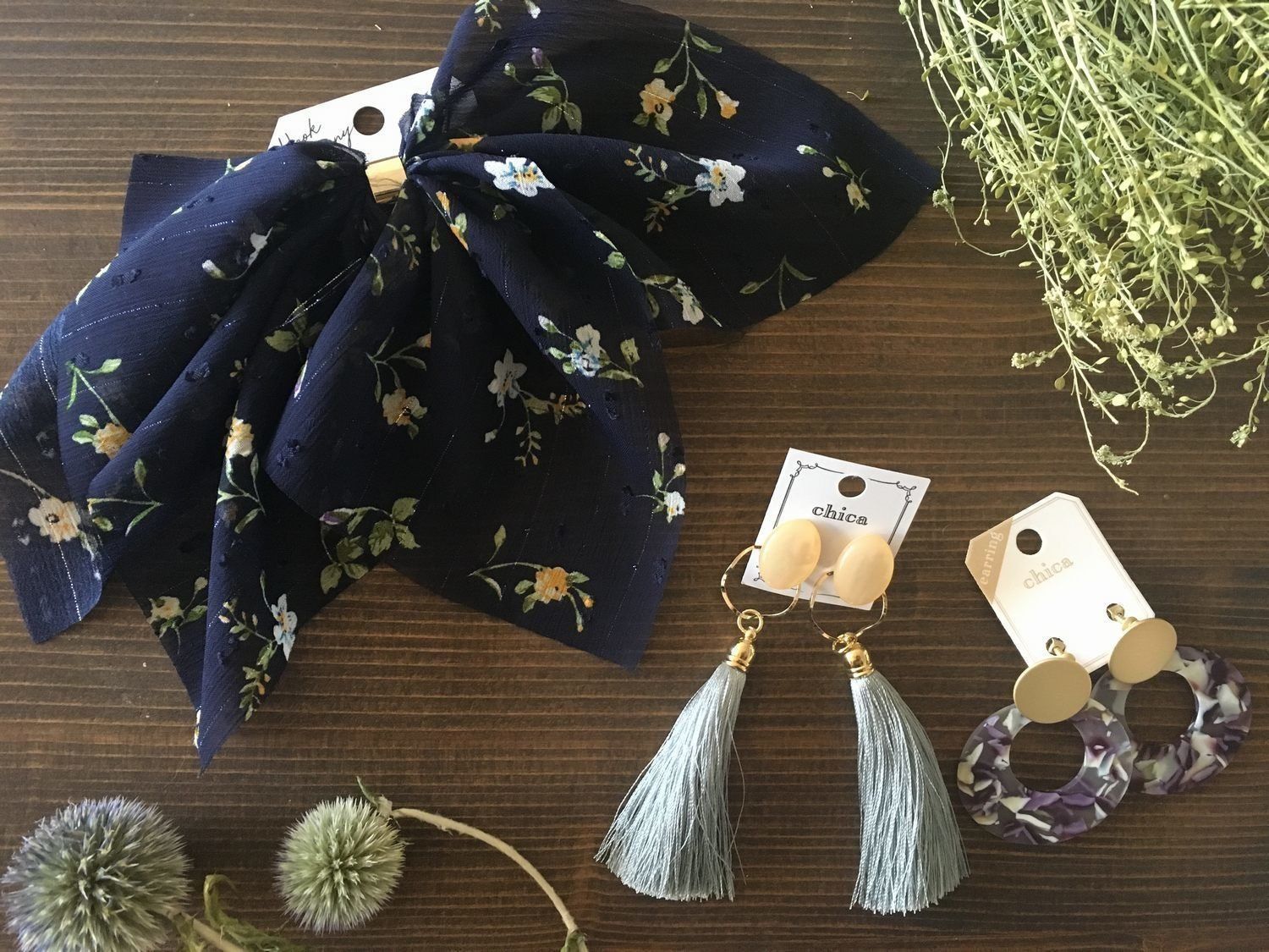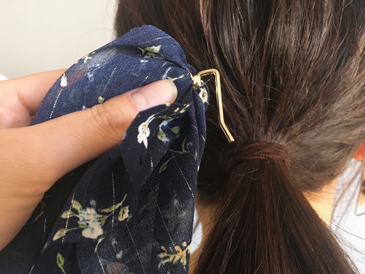 小花柄のヘアフック (300円)は、見た目のボリュームはありますが、柔らかなシフォン素材なので、着けてみると意外と馴染みます。