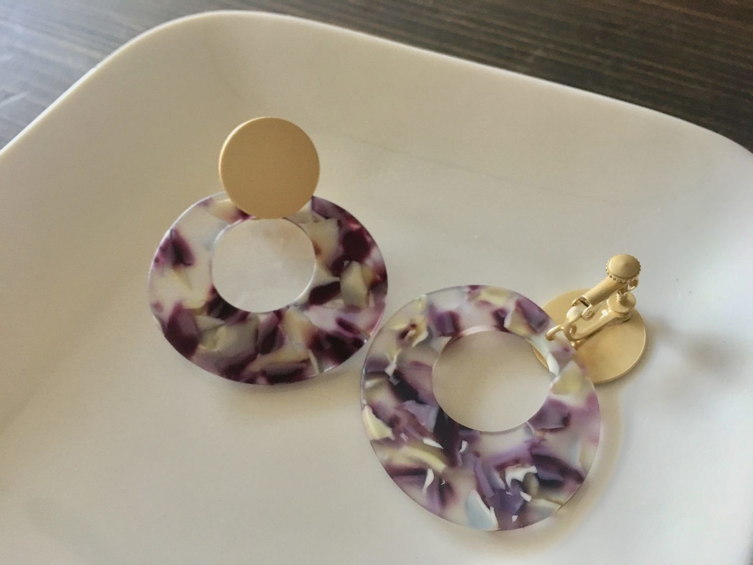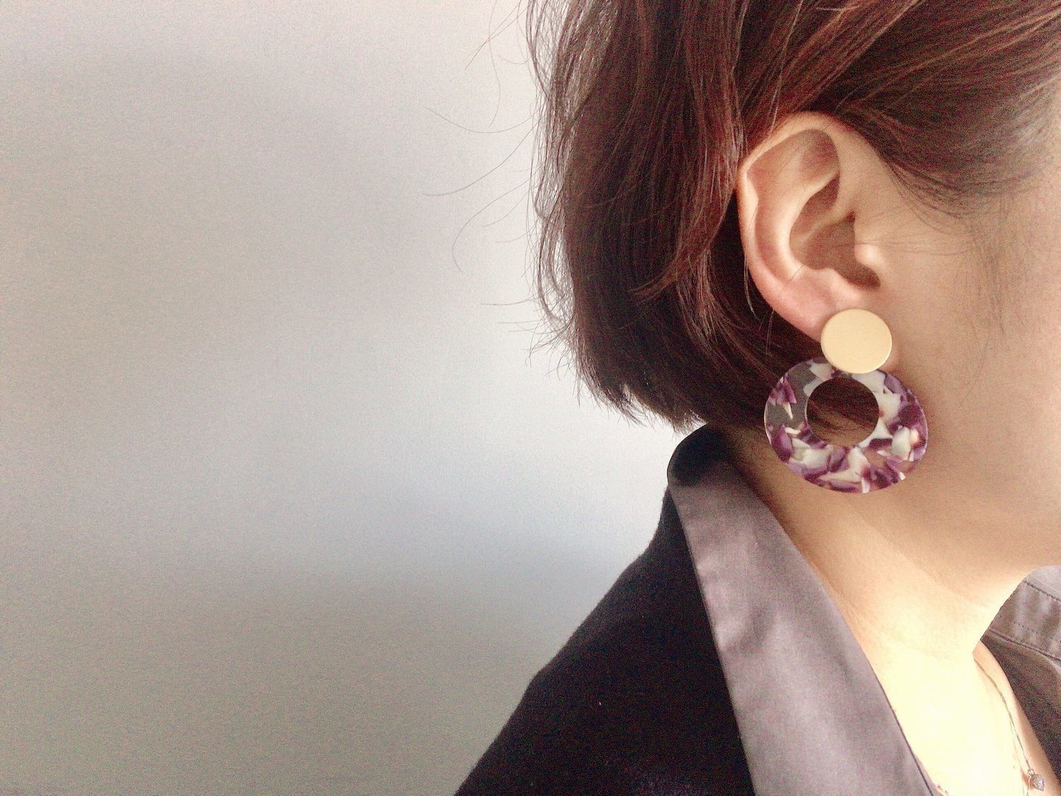 マットなマーブル柄イヤリング(300円)は、楕円形で存在感のある柄。ゴールドの部分もマットな感じで派手すぎず、洋服を選ばない感じです。ダークなカラーのコーディネートのポイントにもいいですよ。