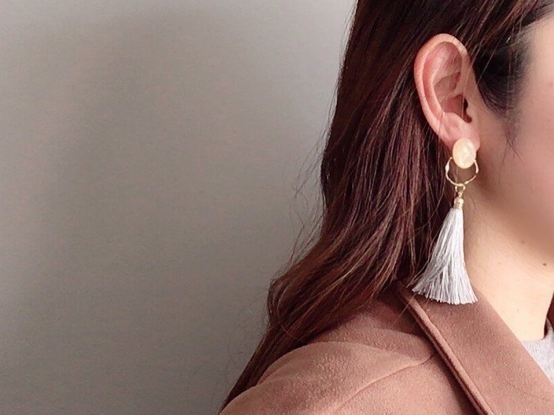 服装が薄着のときは、耳元にポイントがくると華やかな印象に。フリンジのピアス(300円)は長さが約6cmありますが、淡いカラーを選べば肌馴染みして、洋服にも合わせやすいです。
