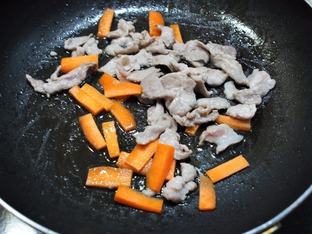 サラダ油大さじ1ほどをフライパンに入れて、まず豚肉を中火で炒めます。火が通ったらさらに人参を入れ、1分ほど炒めたら弱火にします。