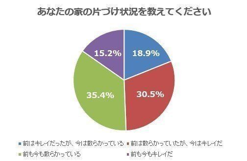 以前と今を比べての、家の片づけ状況について聞きました。いちばん多かったのは「前も今も散らかっている」の35.4%でしたが、「前は散らかっていたが、今はキレイだ」も30.5%と、わずかな差で続きました。