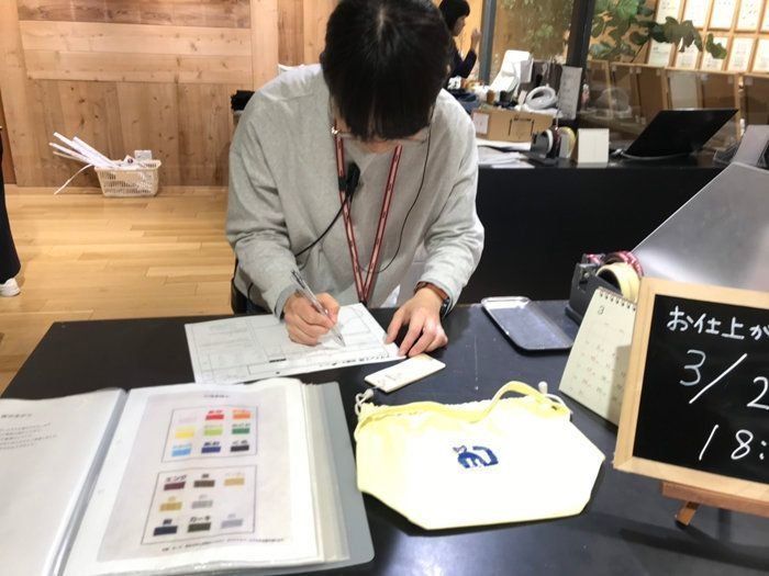 スタッフさんと相談しながらマークを入れる場所、文字を入れる場所、その色などを仮決めしていきます。丁寧に相談にのってくださるので、ちょっとデザインに自信がないかたでも、かわいらしいオリジナルグッズがつくれてしまいますよ!店舗によりますが、即日から2~3週間ほどで完成します!