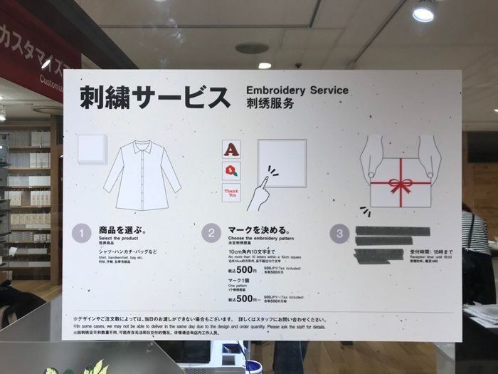 遠足などが間近になり、そろそろ娘にもお弁当袋が必要…というわけで、お弁当袋に刺繍をしてもらうことに。こちらはレジには持って行かず直接「刺繍工房」に持って行き、そこで刺繍代込みのお会計をしてもらうという流れです。