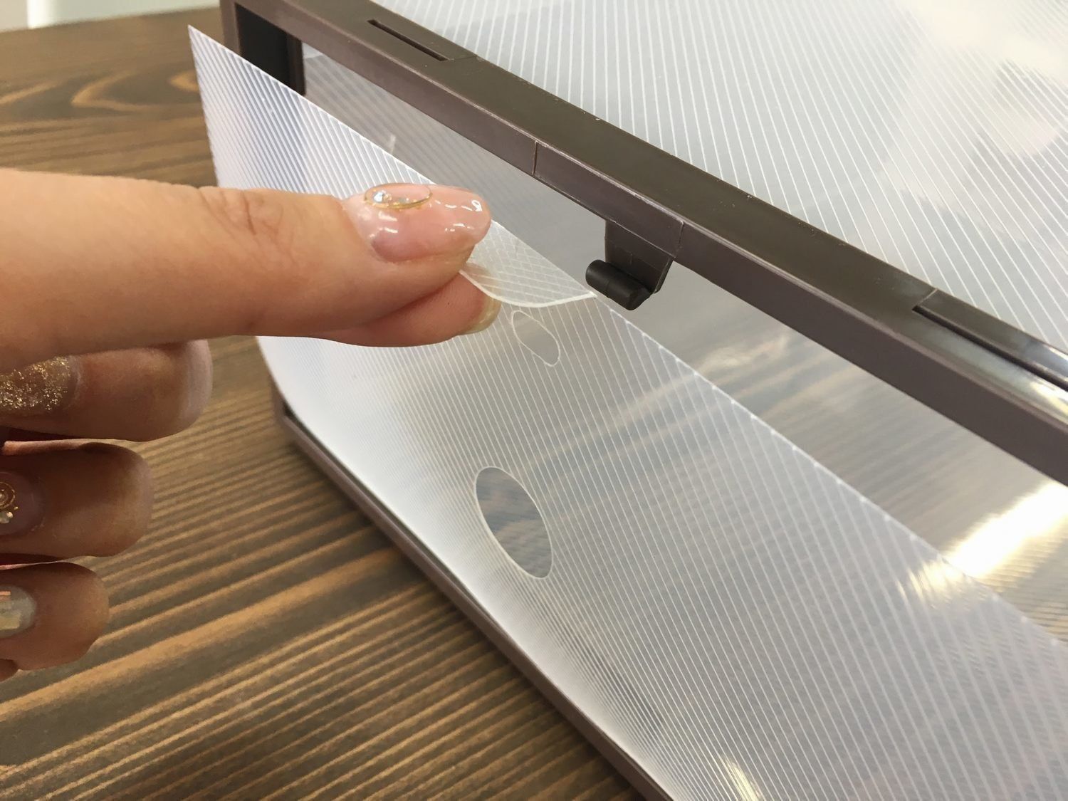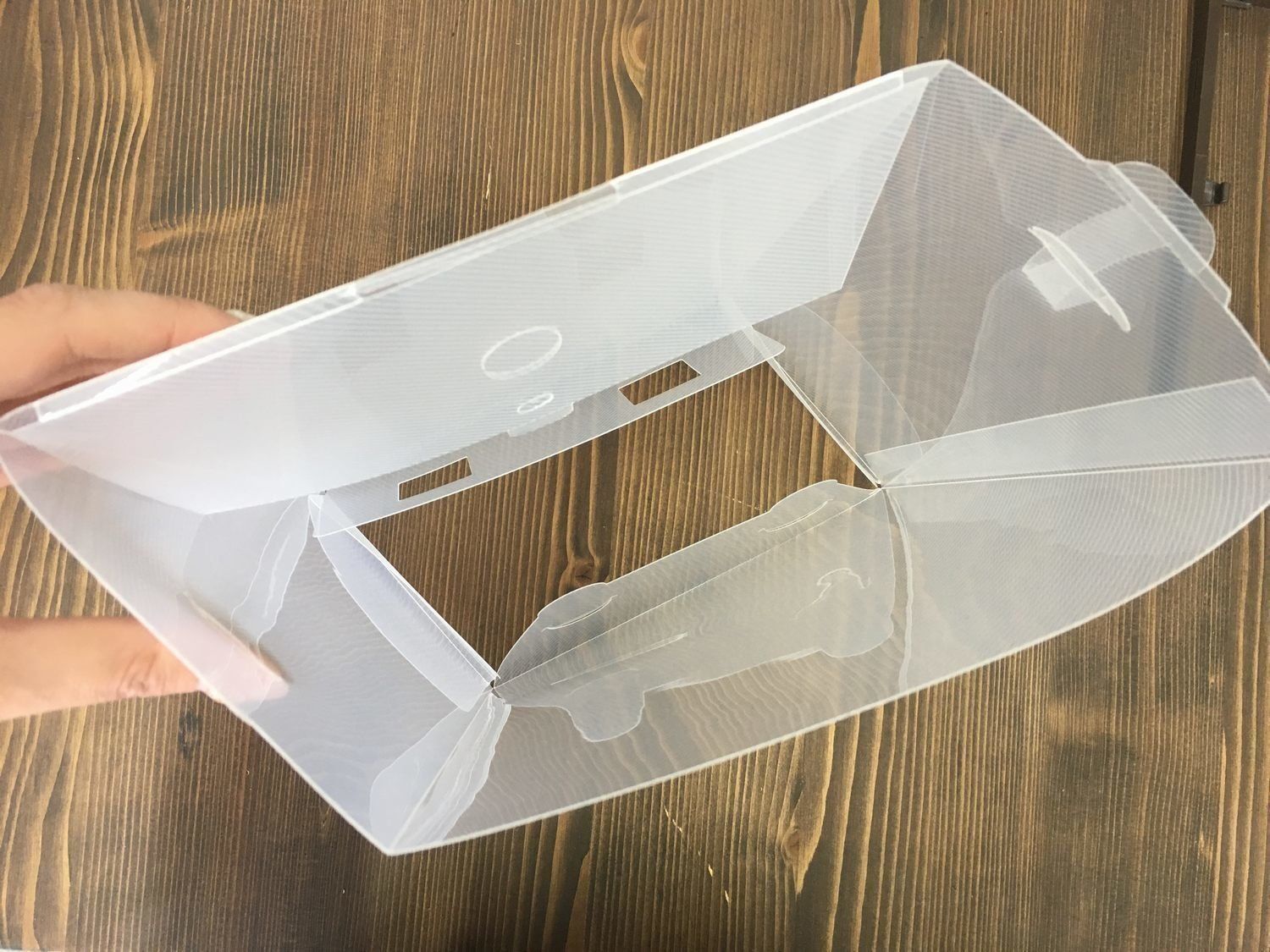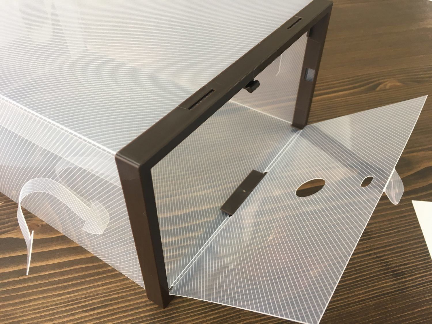 折りたたんである状態からボックスをつくっていきます。ケースの底にあるつまみを入れ込んで、外れないようにセット。次にふたのある方にフレームをはめ込んでいきます。フレーム中央にフックのようなつまみがついている方が上!穴があいている部分にフレームをセットしてできあがりです。