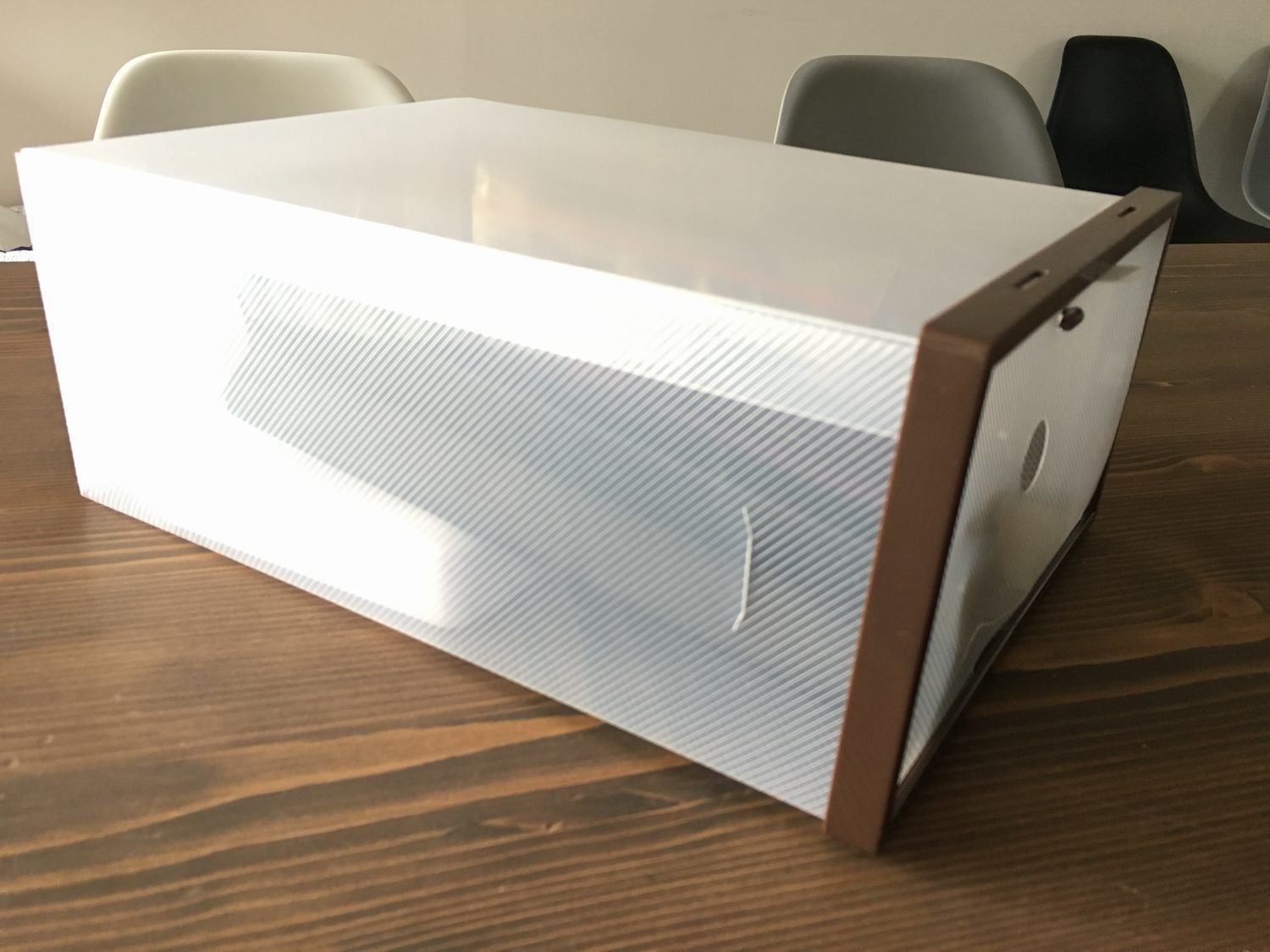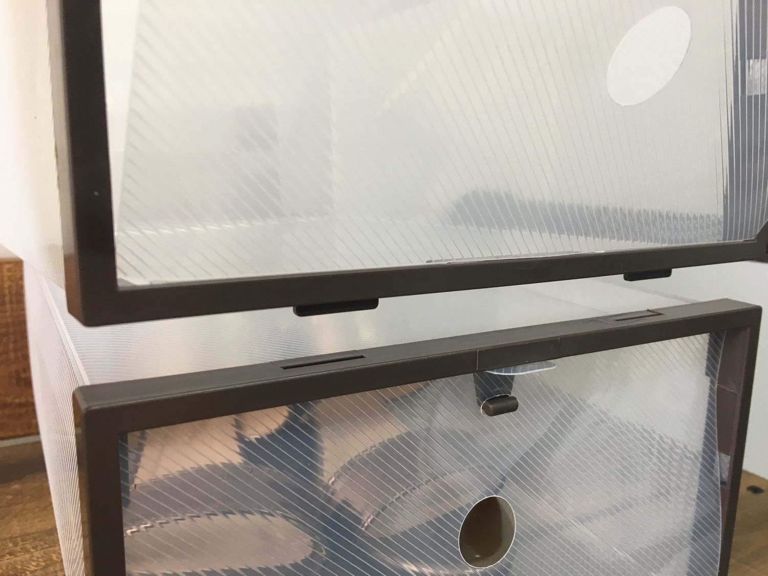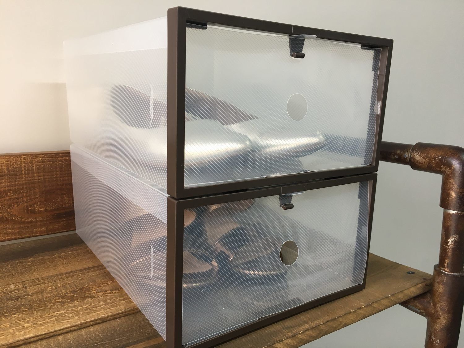 半透明のケースにフレームがセットになっています。カラーバリエーションは黒と茶がありますが、複数使いするなら同じ色でそろえるのがいいでしょう(私は茶色でそろえます)。サイズは(外寸)高さ11.5×横20.5×奥行き28.5cmです。