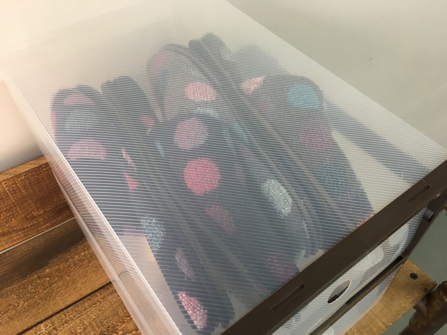 まずは「シューズケース」として利用。シンプルなパンプスを入れてみました。ふたはフレームのフックにカチっとはめ込むだけ!片手でらくらくです。半透明だから、中に何が入っているか確認しやすい。ちなみにこちらはヒールなしのフラットパンプス24cmです。