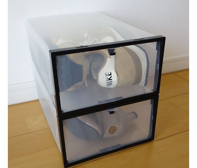 靴だけだけでなく、スリッパの保管用に使うのもおすすめ。写真のように2つ重ねてもきっちりと収納できます。