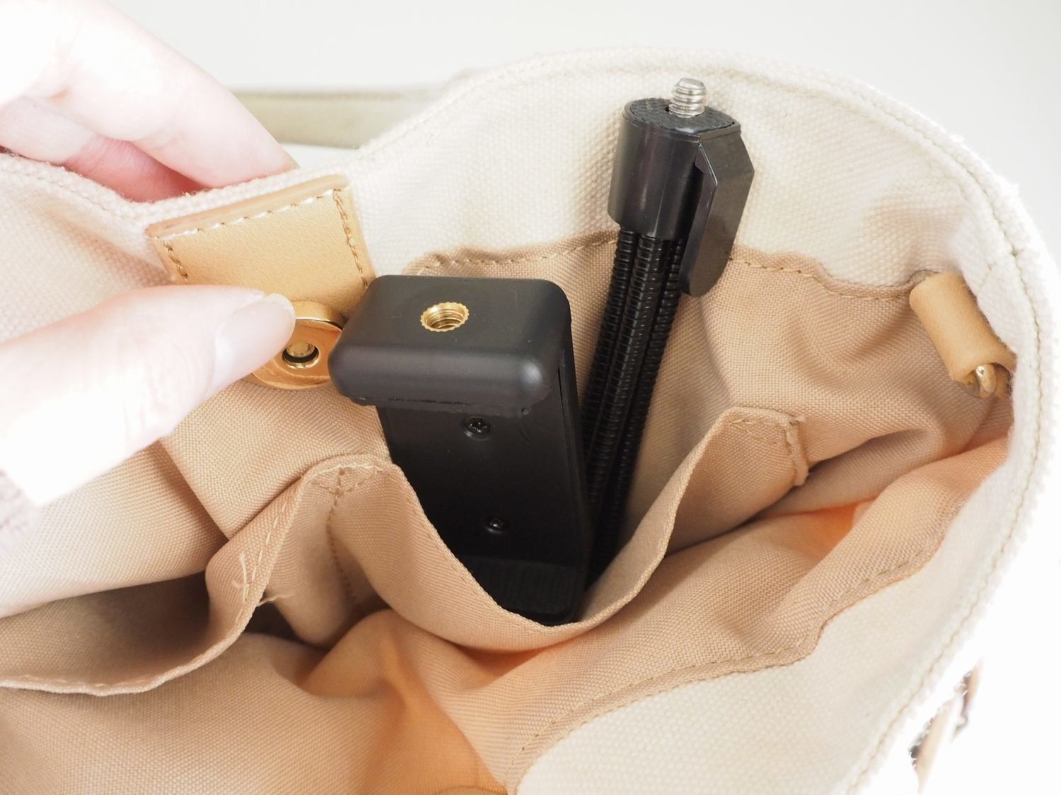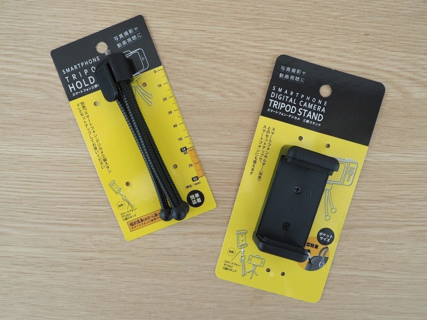 みんなで集合写真を撮ったり、手ぶれ防止に役立つのが三脚セット。左の「スマートフォン・デジカメ三脚スタンド」と右の「スマートフォン三脚ホルダー」の組み合わせで三脚セットになります。