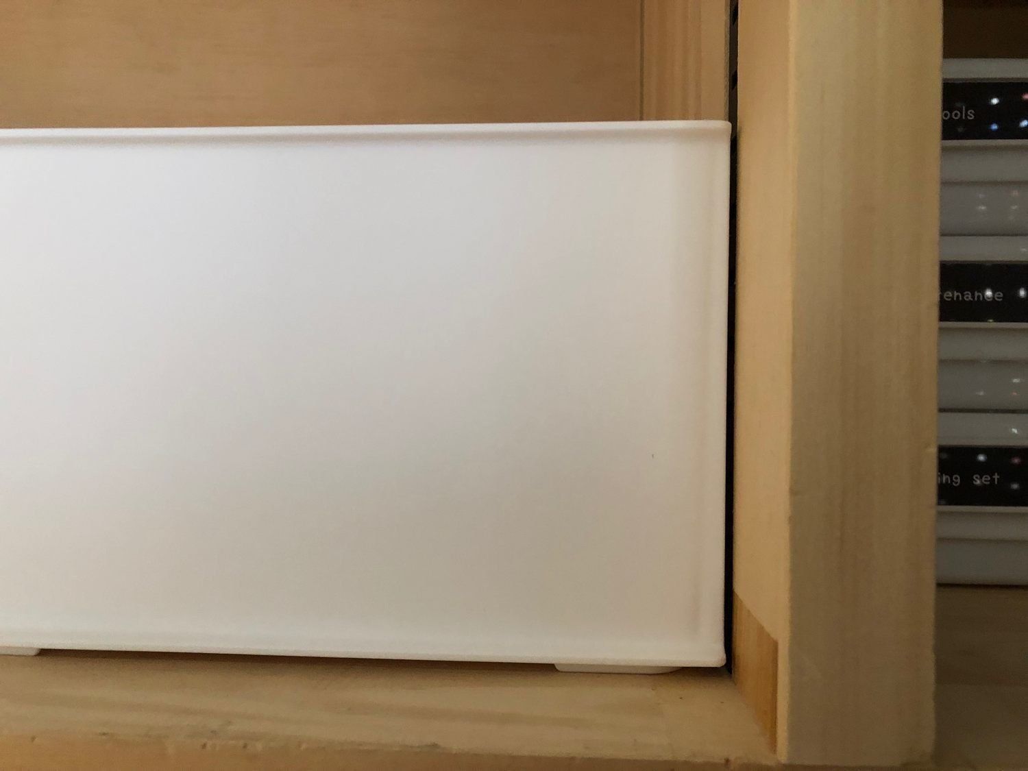 新旧をタテに重ねてみました。下段の旧デザインよりも、上段の新デザインのボックスのほうがピッタリ収まり、壁との隙間も目立ちません。