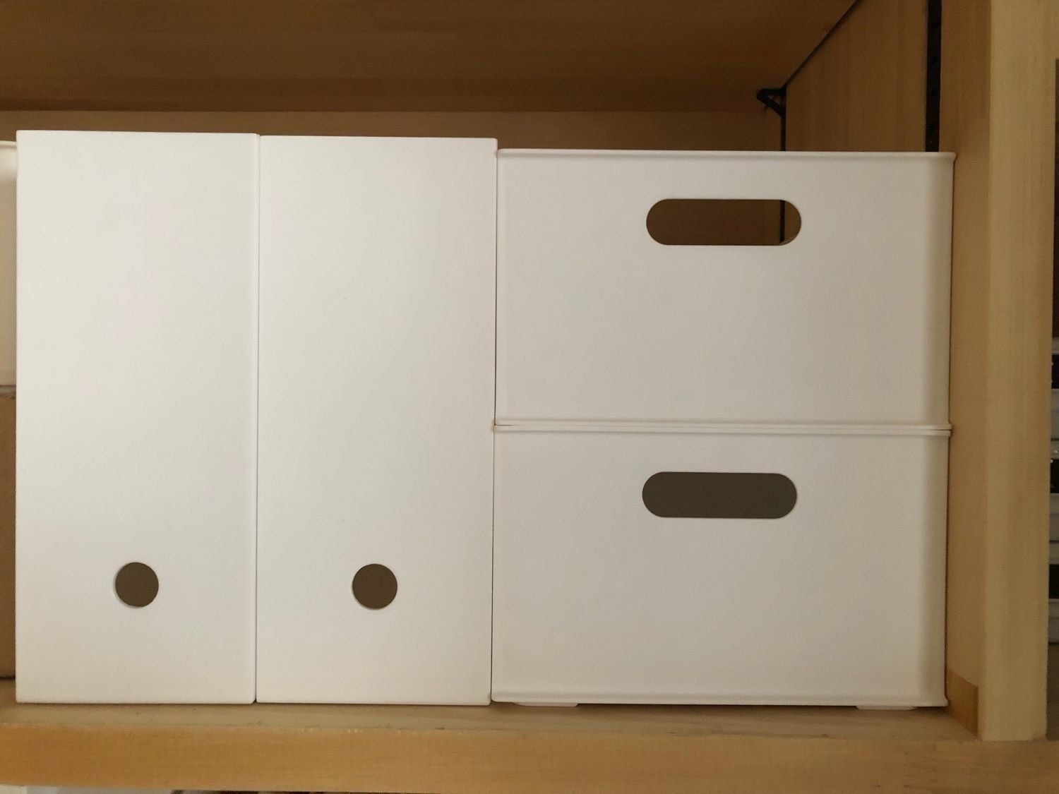 ニトリA4ファイルケース(オールホワイト)と、クウォーターサイズのインボックスを合わせてみました。スッキリピッタリ収まって気持ちがいいですよね。
