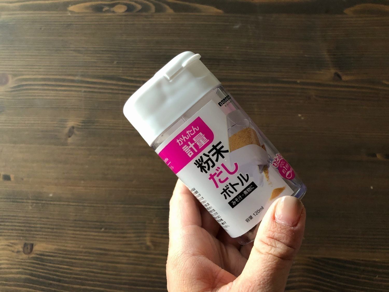 続いてご紹介するのは、計量できる「粉末だしボトル」。こちらも100均で購入しました。