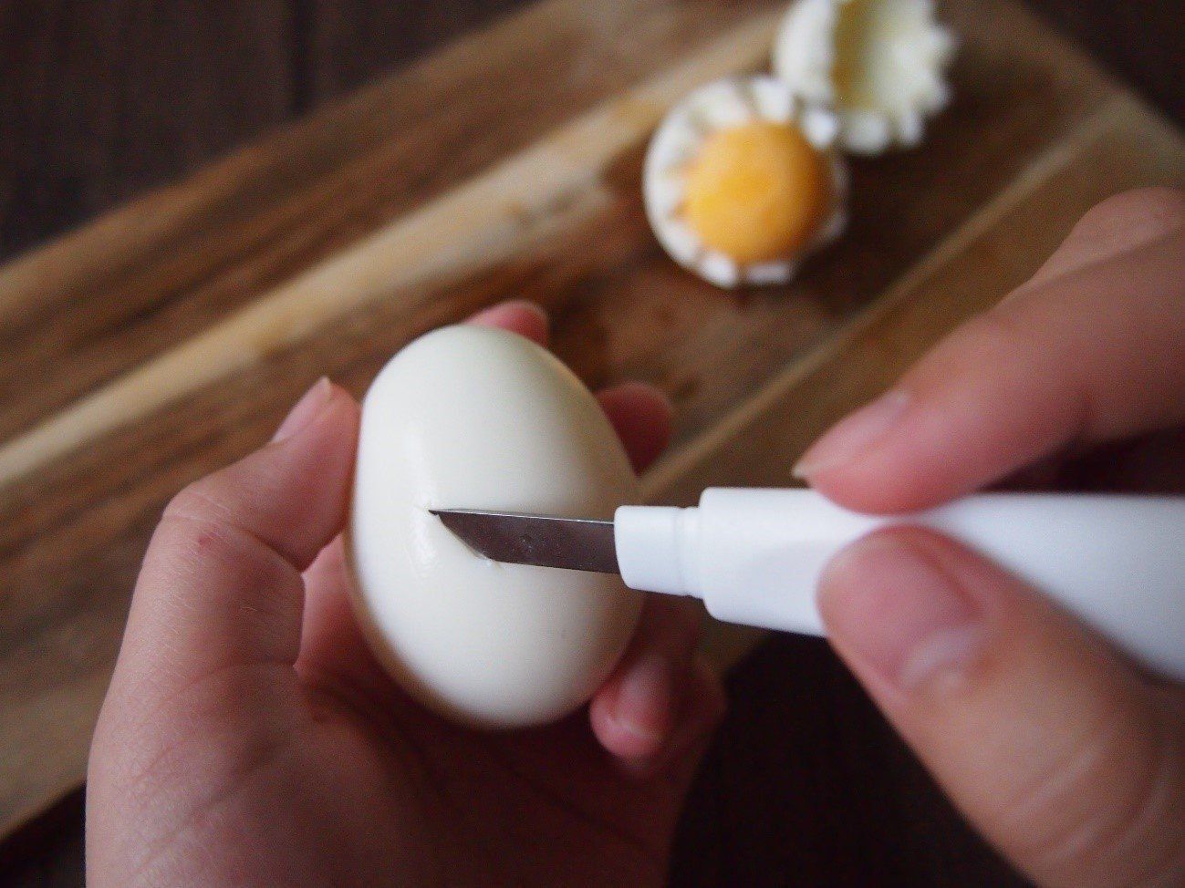 茹で卵の白身の部分をジグザグ一周切っていくと、飾り切りができます。テクニック不要で、いつもの食材が少しかわいくできます。