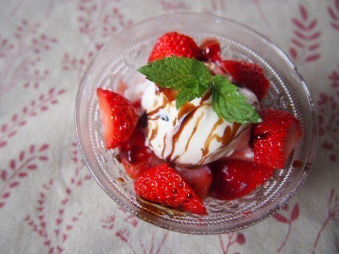 苺とバニラアイスにかけるだけでぐっと高級感ある大人なデザートに変身!!バニラアイスの甘さと「バルサミコ酢醤油」の酸味と塩っけがいい塩梅です。