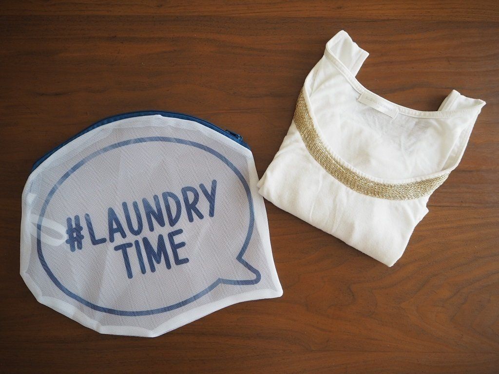 #LAUNDRY TIMEの文字がかわいい洗濯ネット。こちらは完全に洗濯タイムを楽しくするためにデザインのみで購入。容量はキャミソールが1枚入るくらいの大きさ。