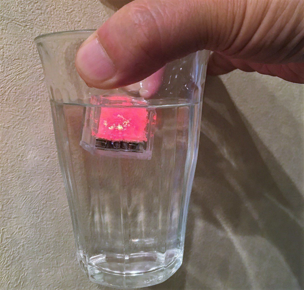 グラスに水を入れて、「LEDキューブライト」をポンと入れると、キューブがグラスにぷかぷか浮かんで光り始めます。