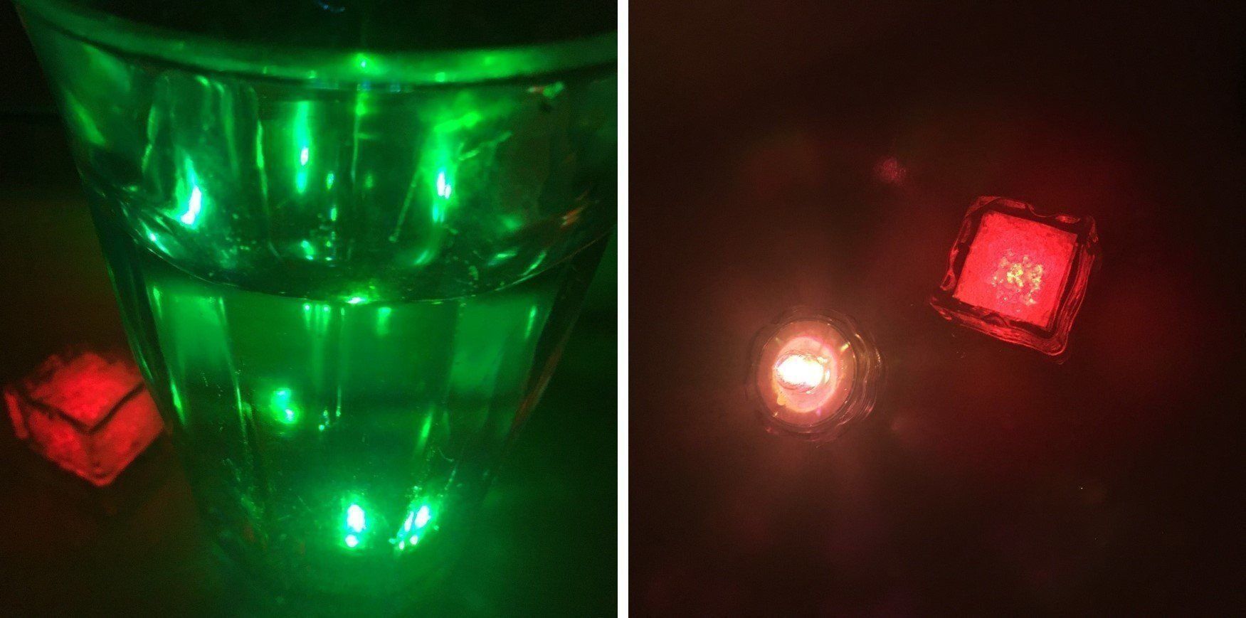 水に浮く「LEDキューブライト」と、水に沈む「インテリアライト」。どちらも同じように7色の光で癒やされます。