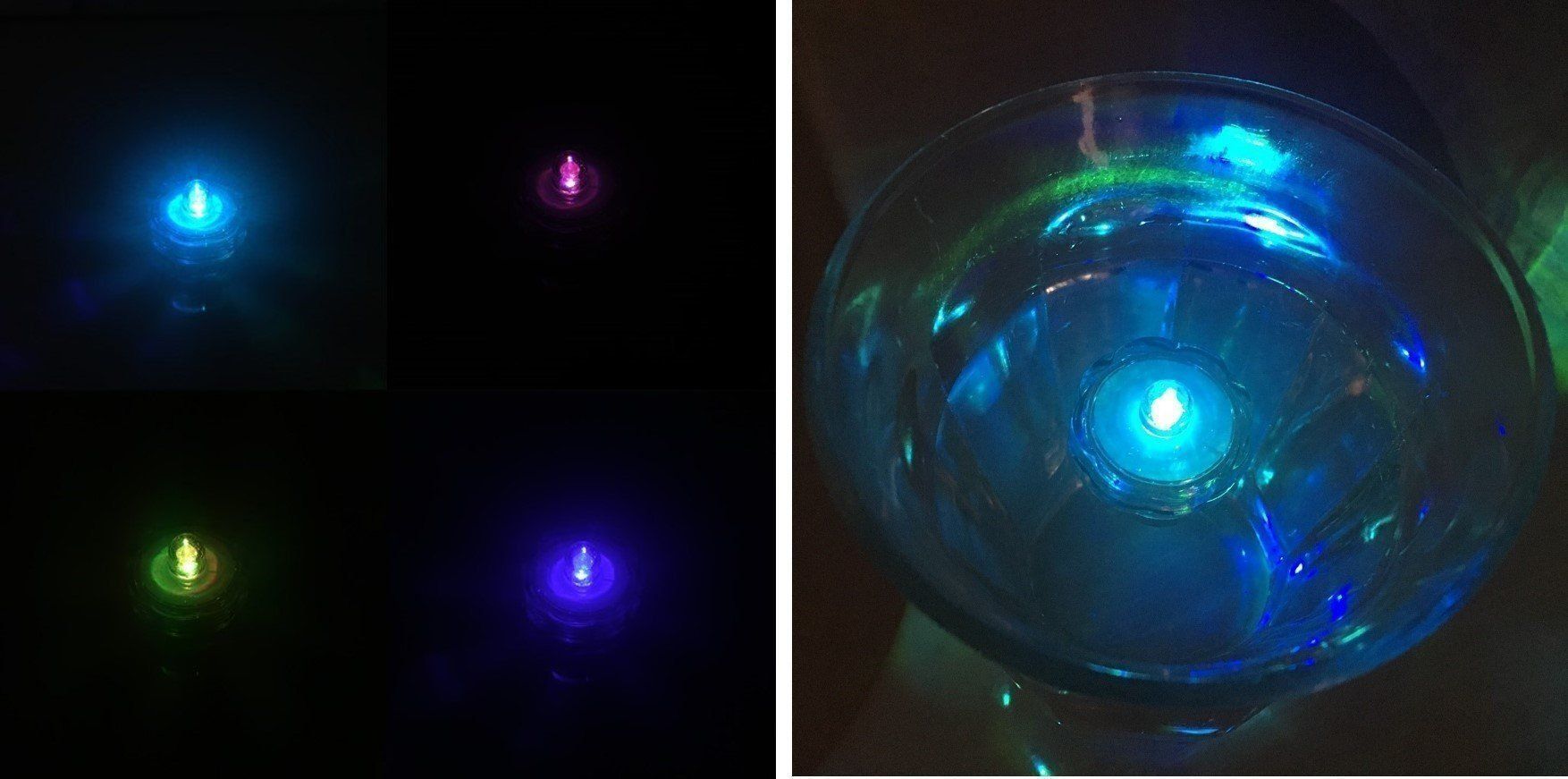 「インテリアライト」は、防水機能つきなので、水の中でも大丈夫!水が入らないように、ふたをギューっと締めてグラスに入れてください。光りながらゆっくり沈んで、幻想的な光の世界が広がります。