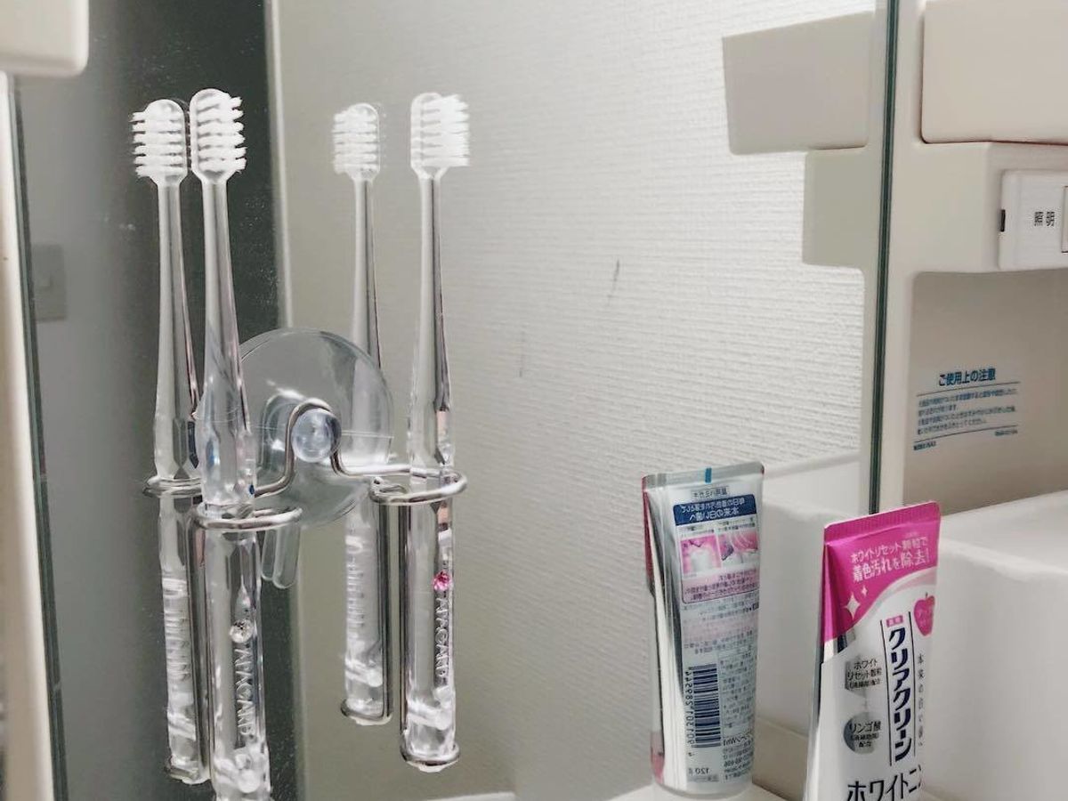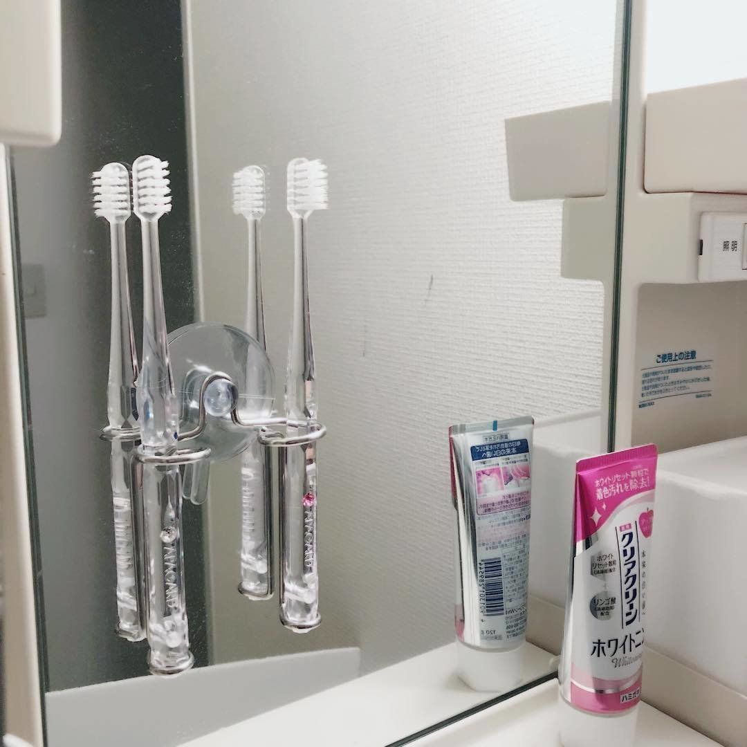 歯ブラシを浮かせて収納できる超便利アイテム。気が付いたら歯ブラシ置き場にヌメリが…なんてこともなくなりますね。歯ブラシスタンドを置かなくてよいので、洗面所の掃除が楽になるかもしれません。
