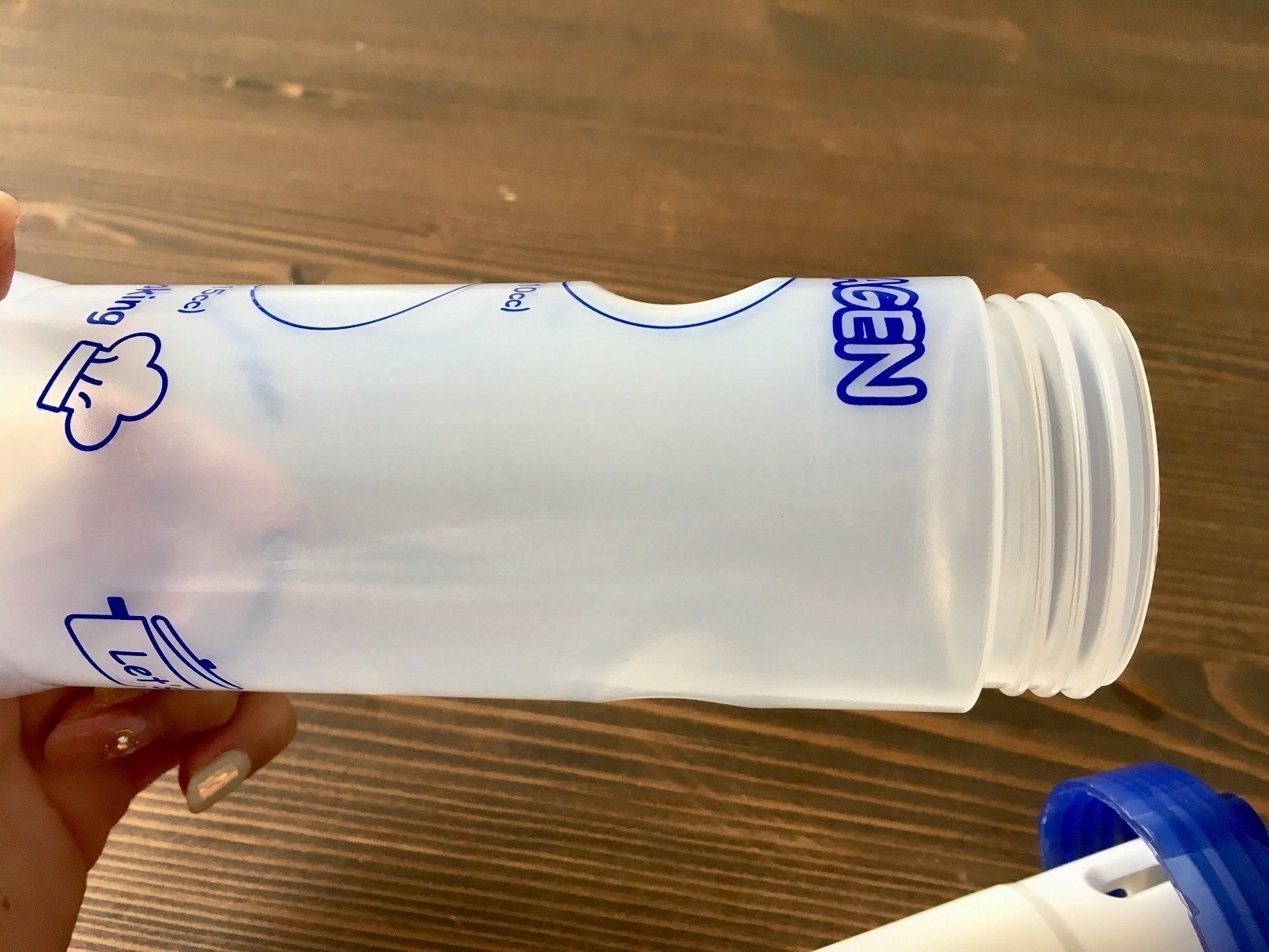 ボトルを横から見ると分かりやすいのですが、一部に凹みがあり、ここでボトルをプッシュすると出る分量が調整されます。上の凹み部分は小さじ2の分量。凹んでいないほうのマル印を押すと、大さじ1が出せます。