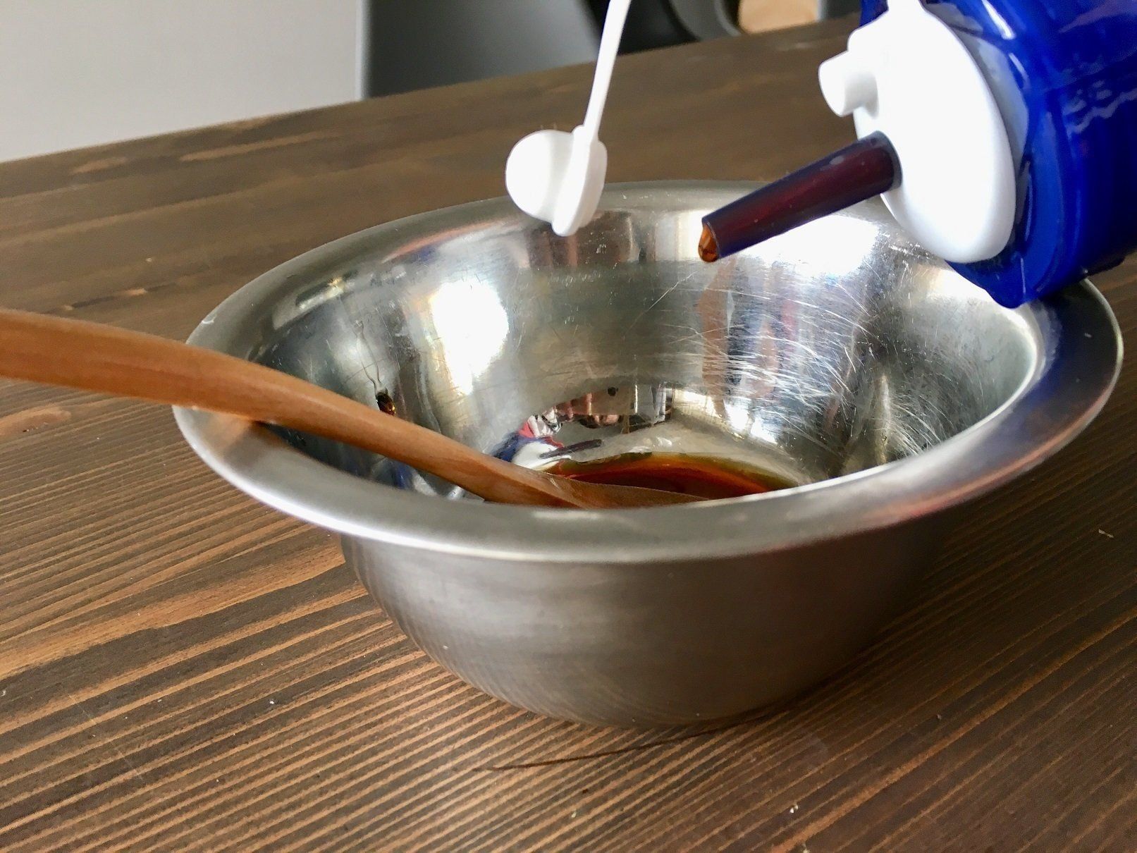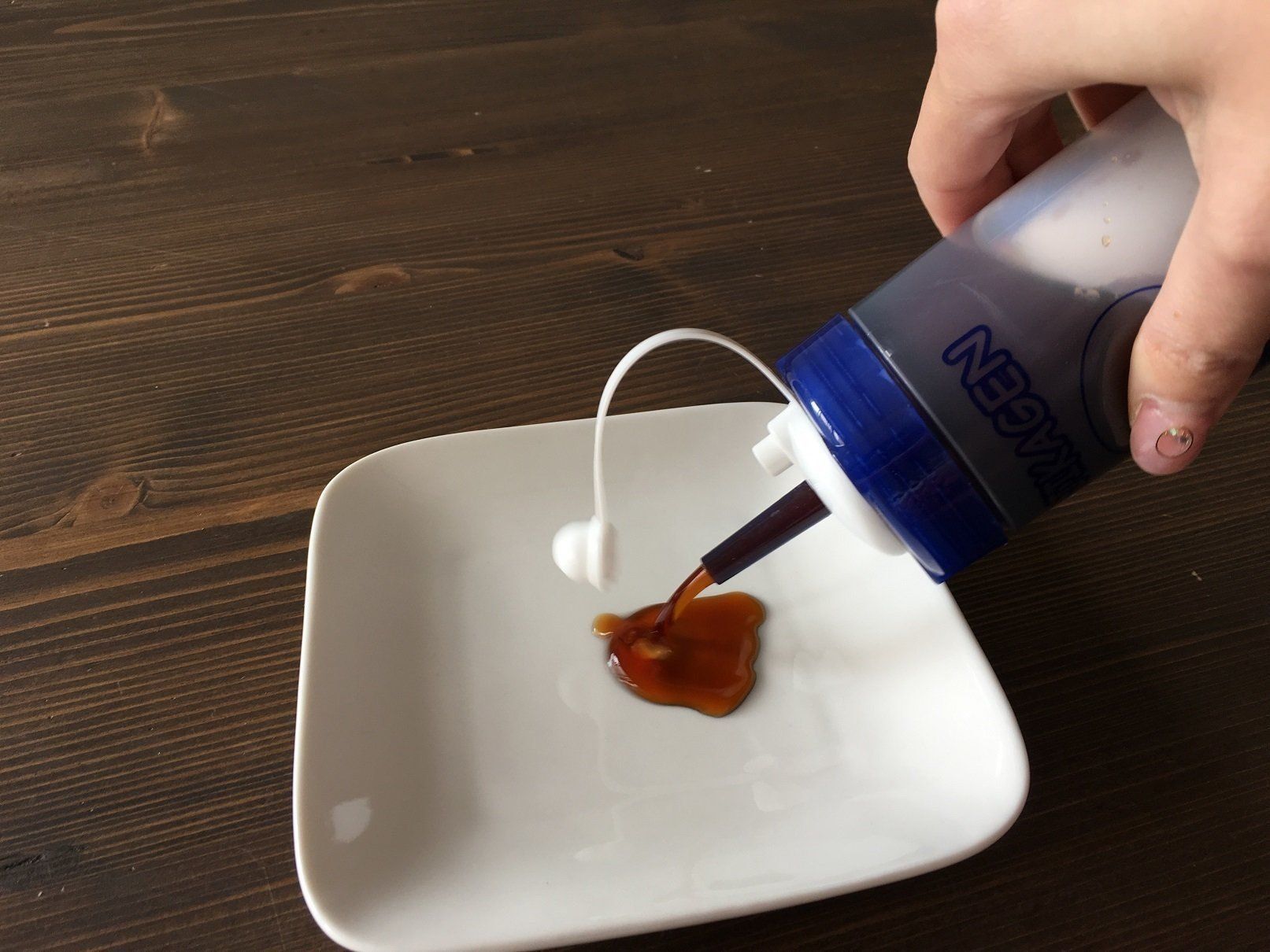 下に向けながら、小さじ2部分を一度押して小皿に出してみました。これで10cc。ふだんの食事のときなどはワンプッシュでいいですよね。出しすぎが無くなります。